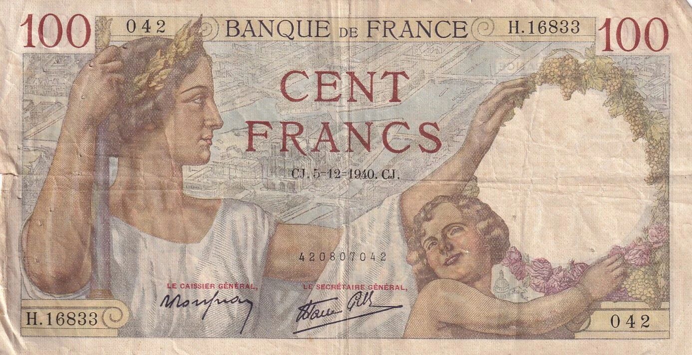 This banknote, issued by France, has a nominal value of 100 francs. It dates from December 5, 1940 and bears the serial number H.16833.