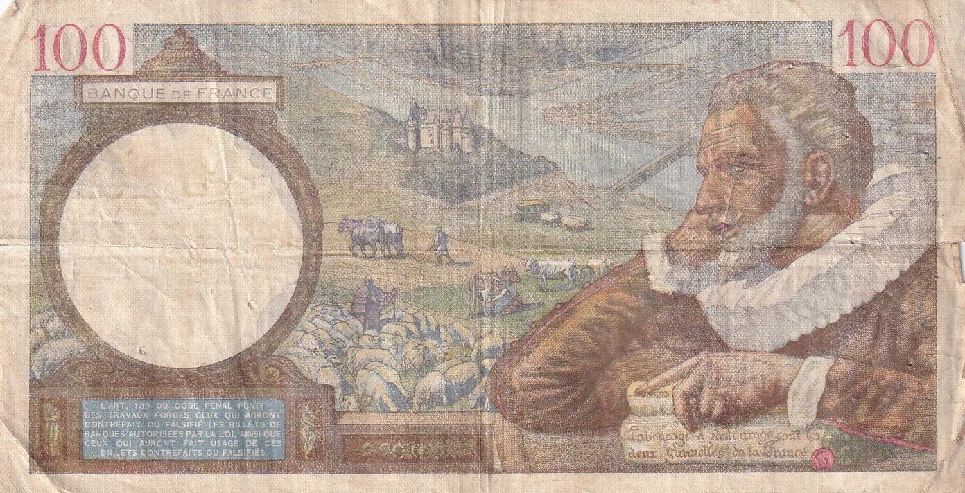 On the back, the banknote features Sully, depicted on the right holding a parchment. The background consists of a picturesque pasture landscape. Ernest Deloche is the engraver of this banknote, while Lucien Hector Jonas is the designer.