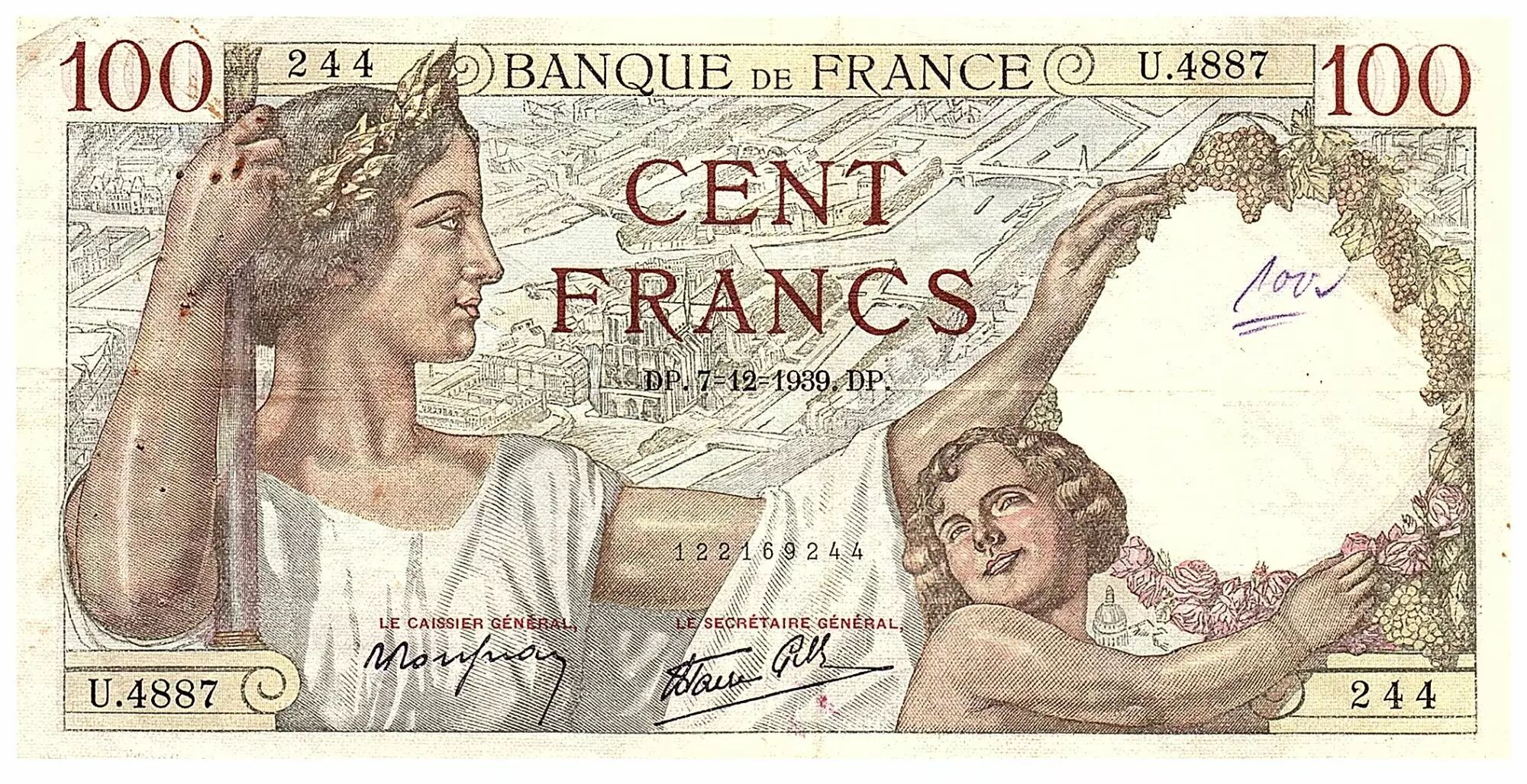 Home > > France 100 Francs Sully - 07.12.1939 - Serial U.4887 - Fay.26.17