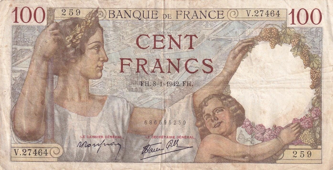 This banknote, issued by France, has a face value of 100 francs. It was issued on 08-01-1942 and bears the serial number J.27495.