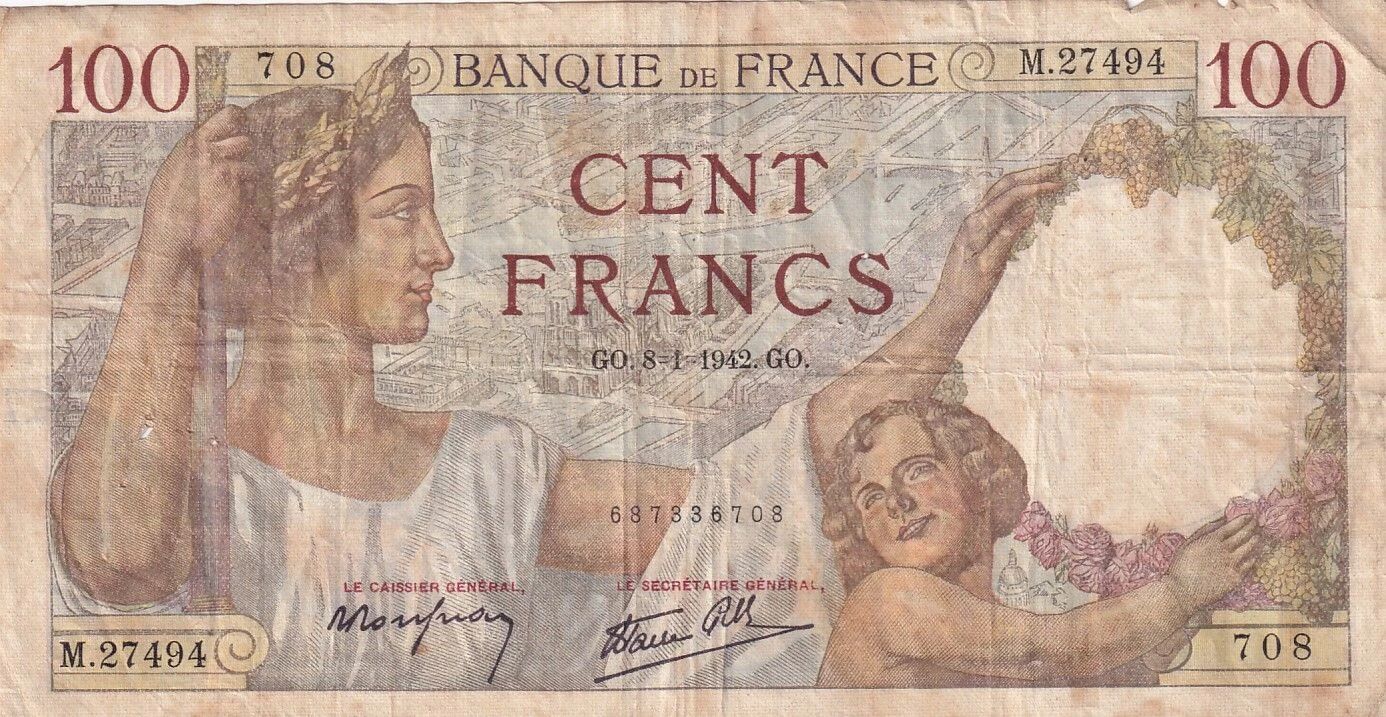 Ce billet de banque, émis par la France, a une valeur nominale de 100 francs. Il a été émis le 08-01-1942 et porte le numéro de série M.27494.
