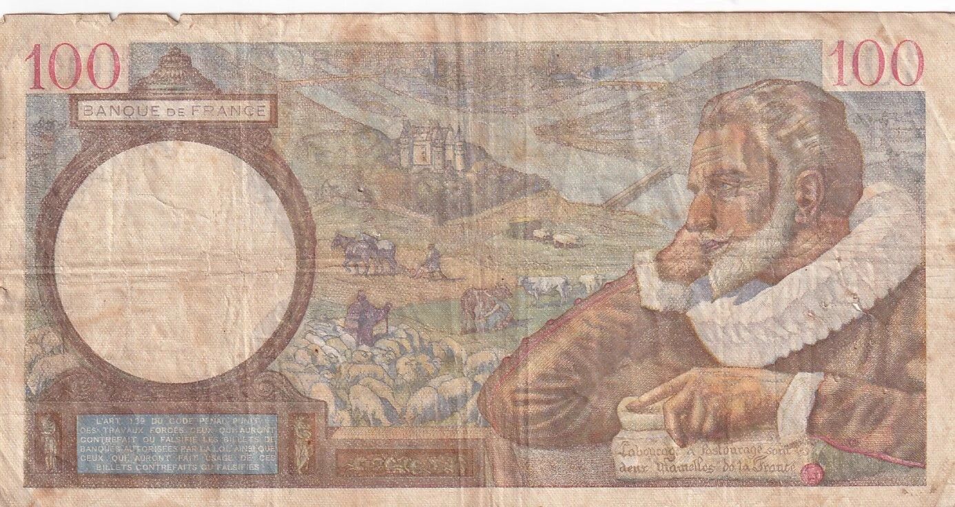 Le verso du billet met en scène Sully, représenté sur la droite, tenant un parchemin. L'arrière-plan est composé d'un paysage pittoresque de pâturage, évoquant un environnement rural et paisible.