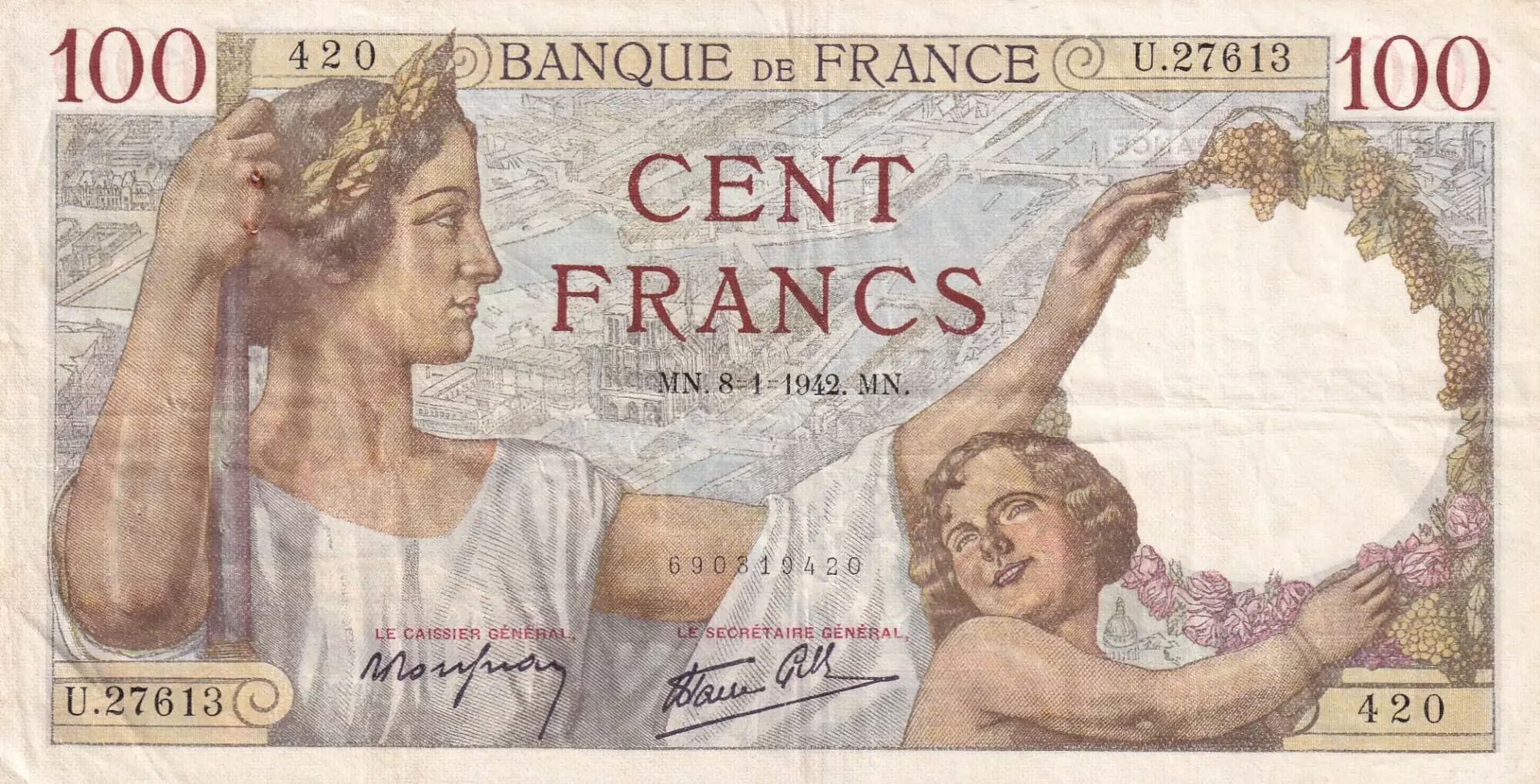 Billet France 100 Francs Sully - 08-01-1942 - Série U.27613