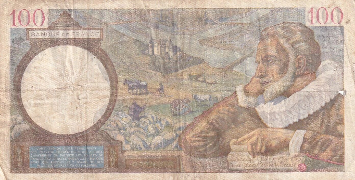 Le verso du billet met en scène Sully, représenté sur la droite, tenant un parchemin. L'arrière-plan est composé d'un paysage pittoresque de pâturage, évoquant un environnement rural et paisible.