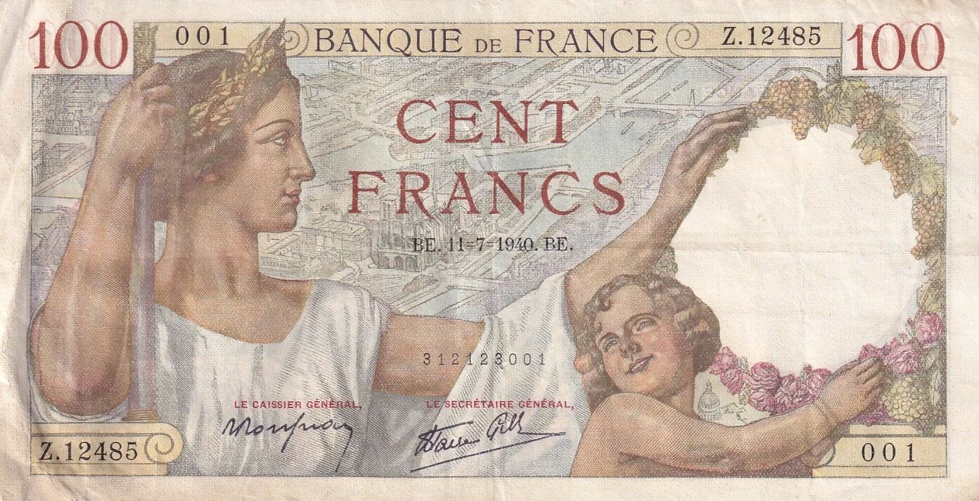 This French banknote, with a face value of 100 francs, was issued on July 11, 1940. It belongs to series Z.12485. The weight of the banknote is 1 gram and its dimensions are 180 mm in length by 92 mm in width.