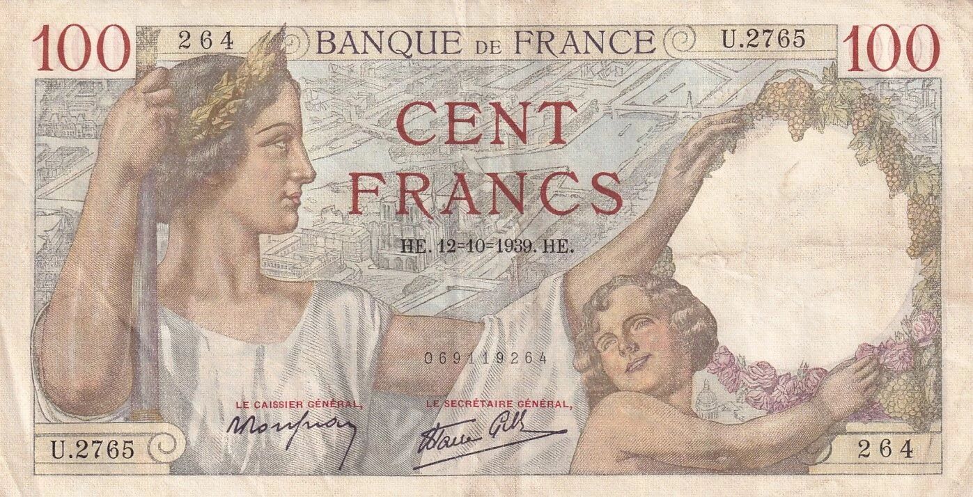 Le billet de 100 Francs Sully, émis le 12 octobre 1939, appartient à la série U.2765. Il s'agit d'un billet de la Banque de France, représentant une valeur nominale de 100 francs.