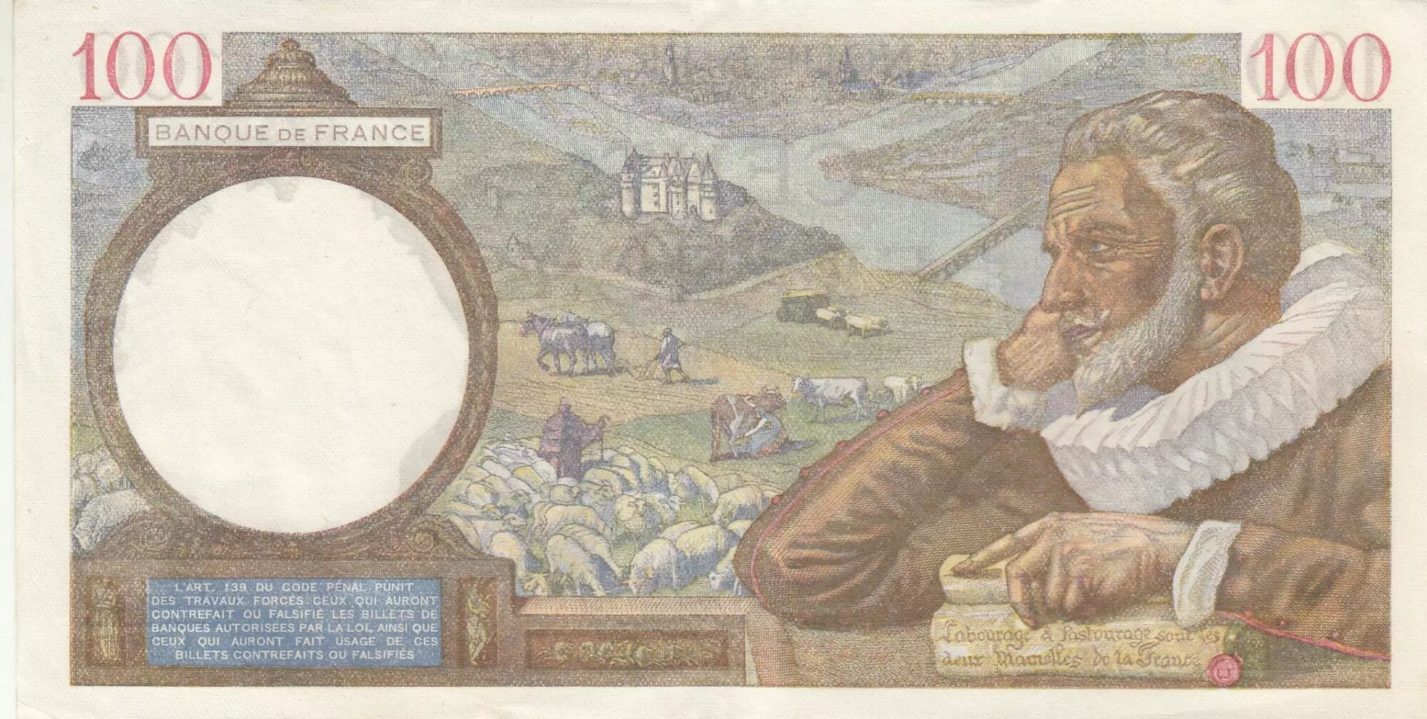 The reverse of the banknote depicts agriculture, through the busts of a young woman and a young man, the latter carrying a tool on his shoulder. These figures are inspired by the painter's children. The background is decorated with the same plant elements as the obverse, creating visual coherence. The mentions "BANQUE DE FRANCE" and the face value "500 FRS" are repeated. A legal inscription recalls the penal sanctions incurred in the event of counterfeiting or falsification of banknotes. Marguerite Dreyfus (Rita) engraved this reverse, also based on a drawing by Sébastien Laurent.