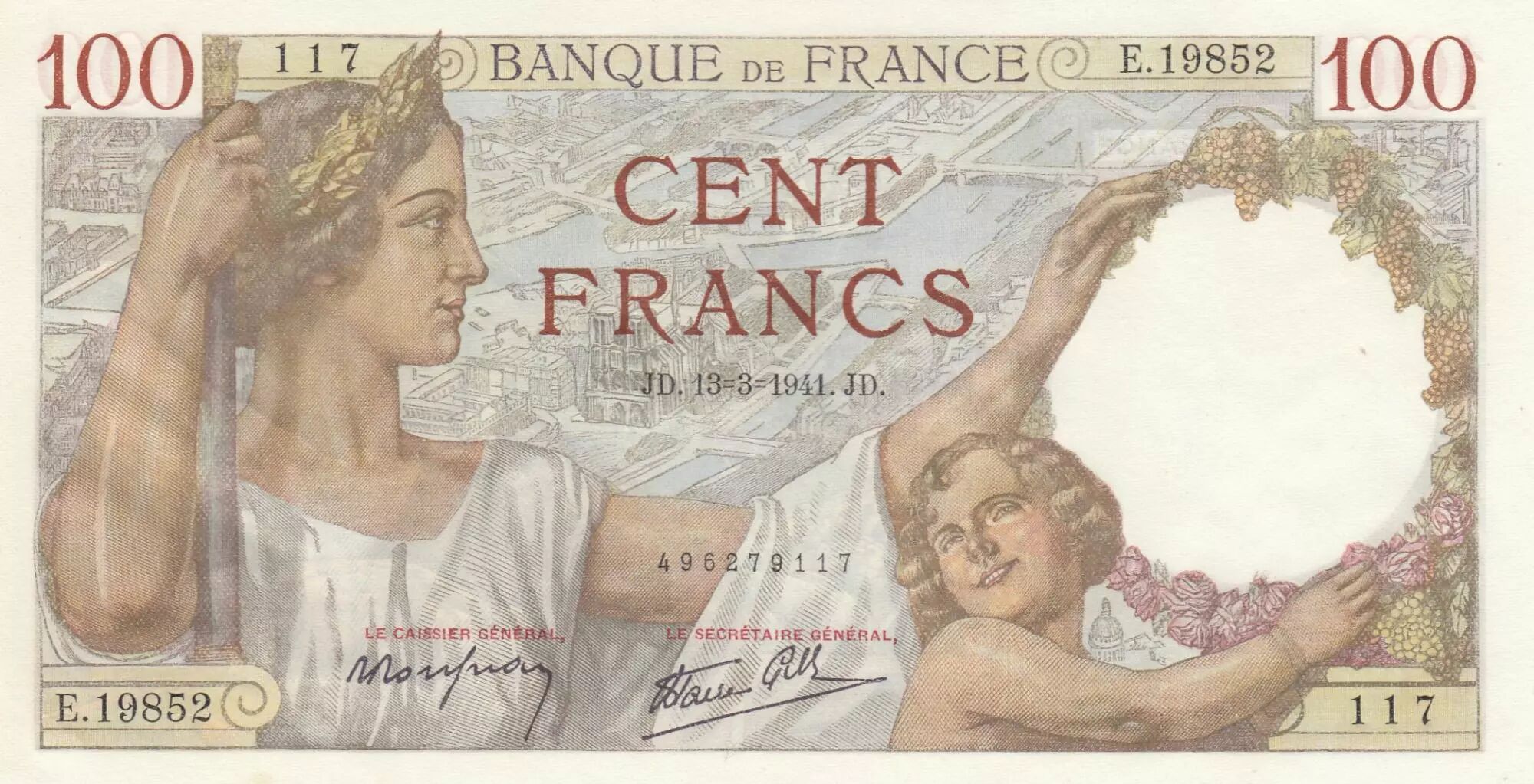 Billet France 100 Francs - Sully - 13-03-1941 - Série E.19852