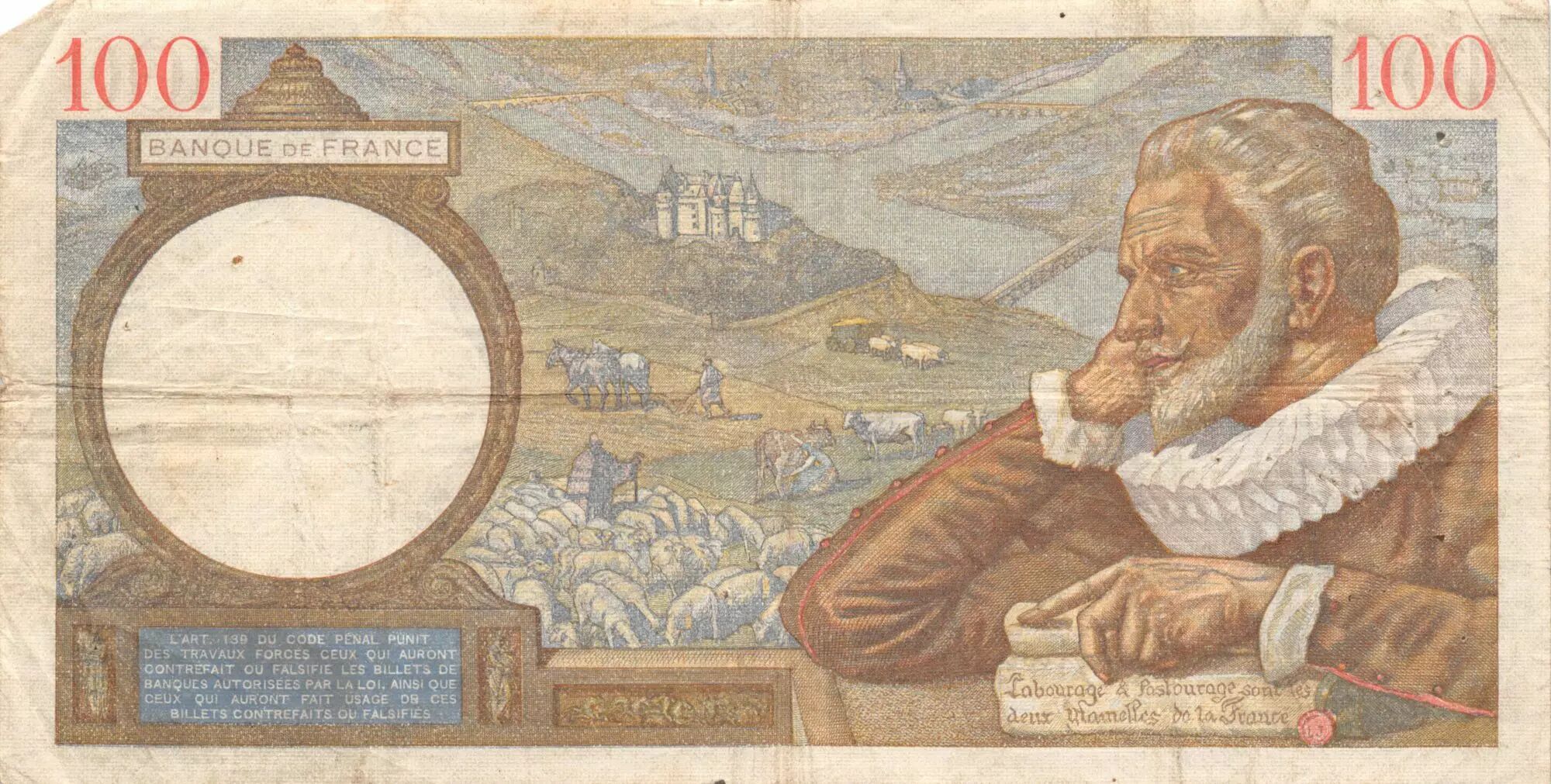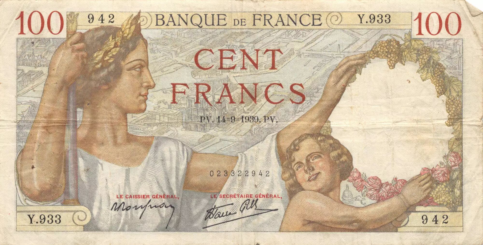 Accueil > Archivage > archivage-Archivage > France 100 Francs Sully - 14-09-1939 Série Y.933 - TB+
