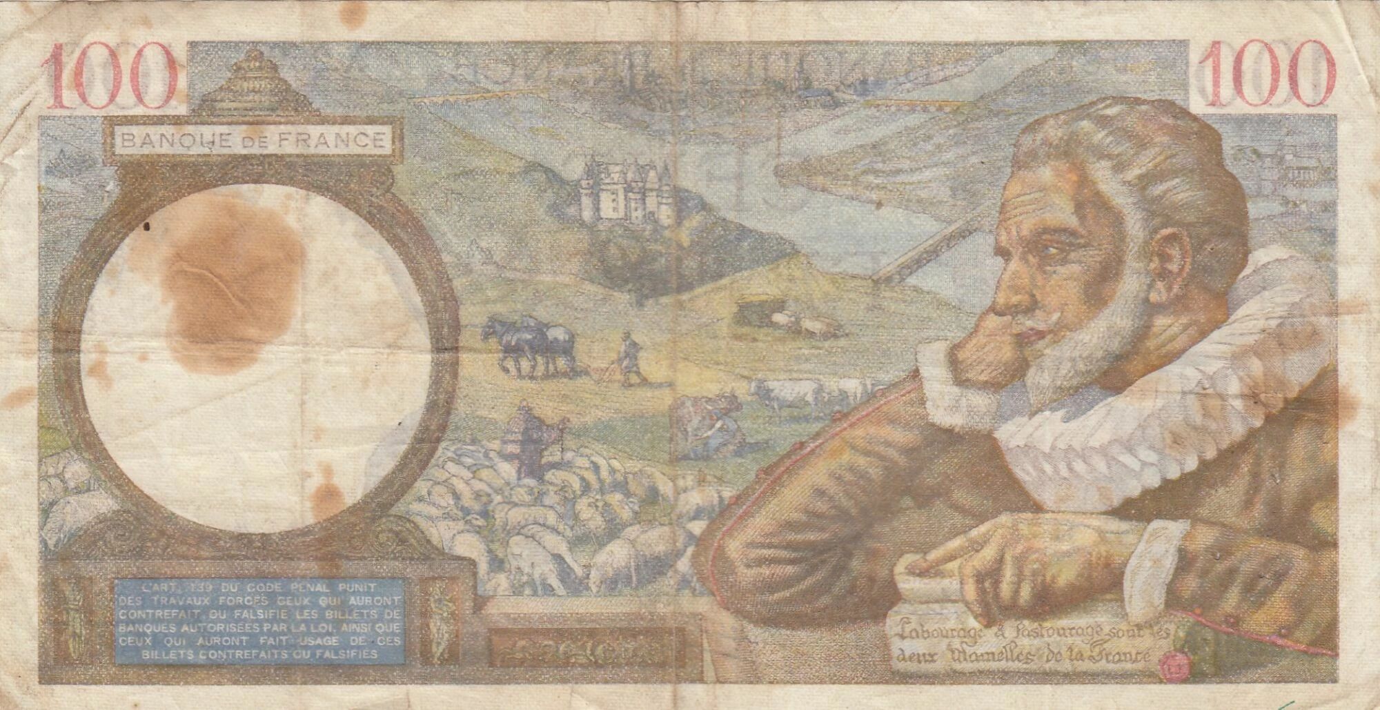 Le billet est désigné sous le nom de "Sully", probablement en référence à un personnage historique ou un motif iconographique spécifique qui orne le billet. La valeur nominale du billet est de 100 francs, l'unité monétaire de la France à l'époque de son émission. Son poids est de 1 gramme.