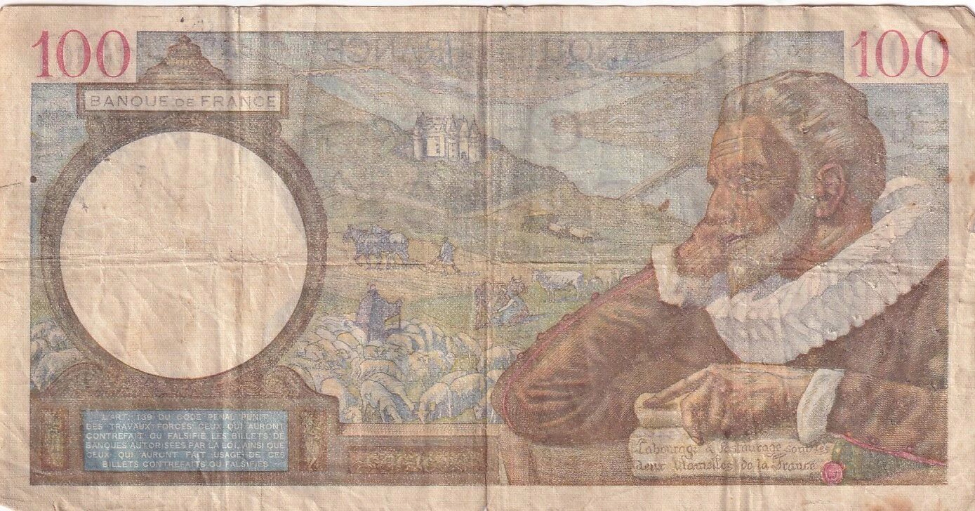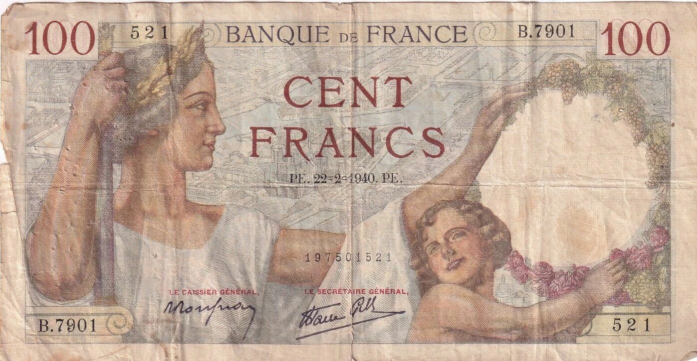 Ce billet de banque français, d'une valeur nominale de 100 francs, a été émis le 22 février 1940. Il appartient à la série B.7901. Ses dimensions sont de 180 mm de longueur et 92 mm de largeur.