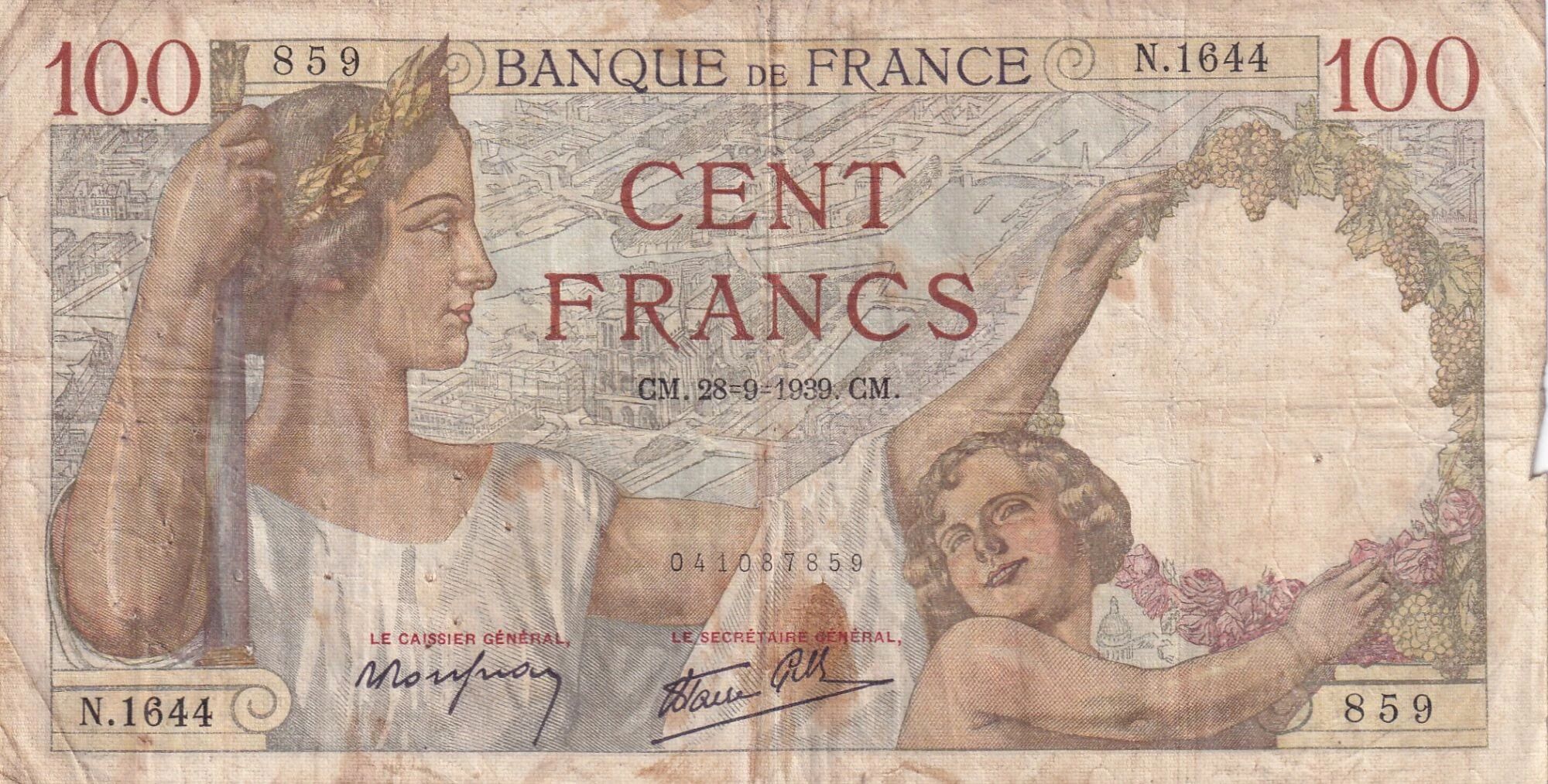 Ce billet de banque français, d'une valeur nominale de 100 francs, a été émis le 28 septembre 1939 et porte le numéro de série N.1644.