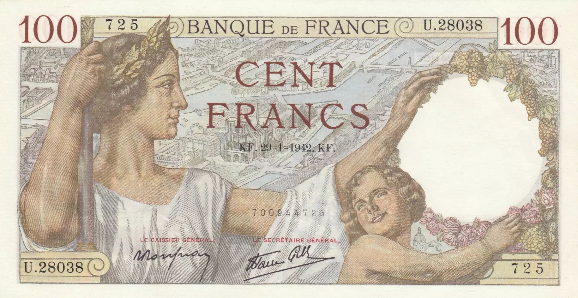 Banknote France 100 Francs - Sully - 29-01-1942 - Serial U.28038
