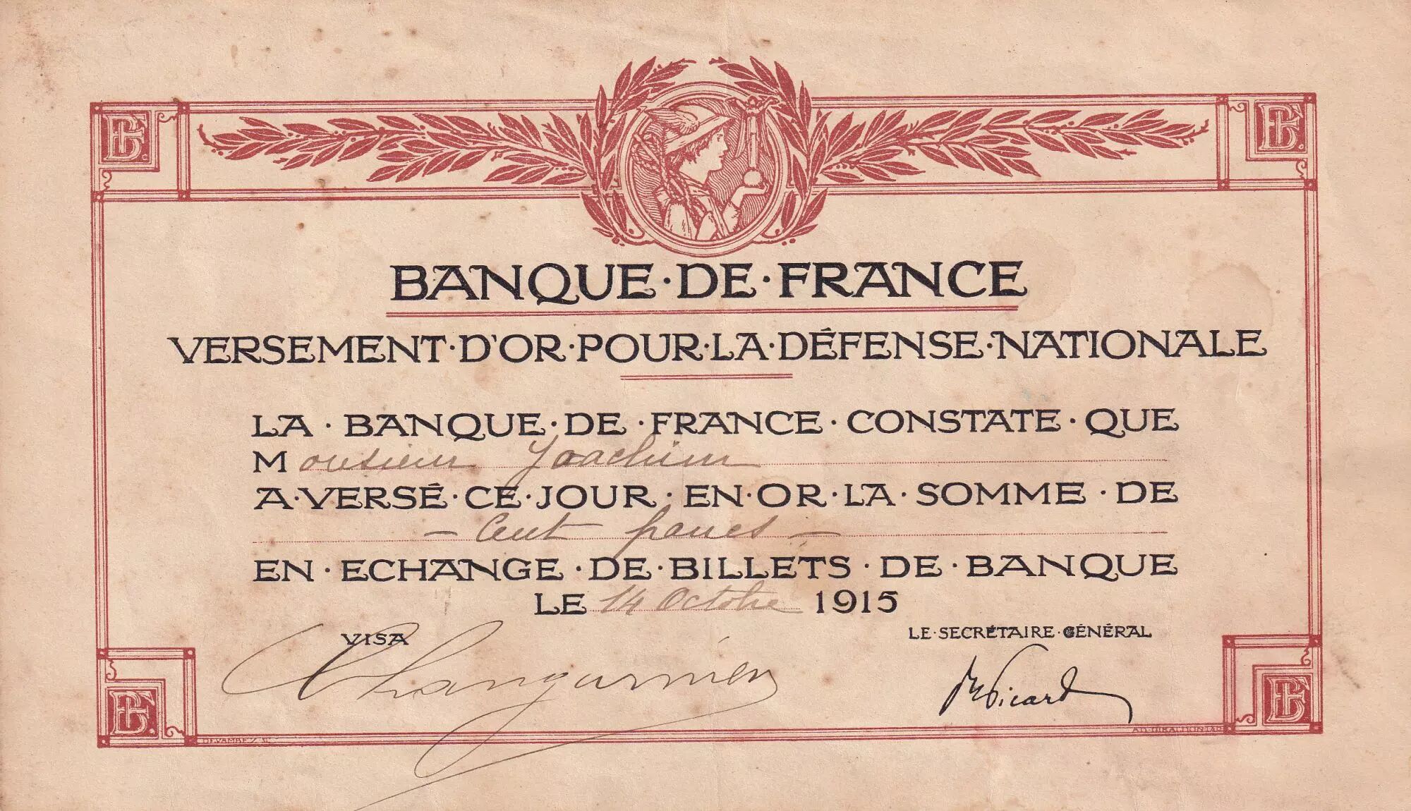 Accueil > Archivage > France 100 Francs - Versement d'or pour la défense nationale - 14-10-1915 - TTB+