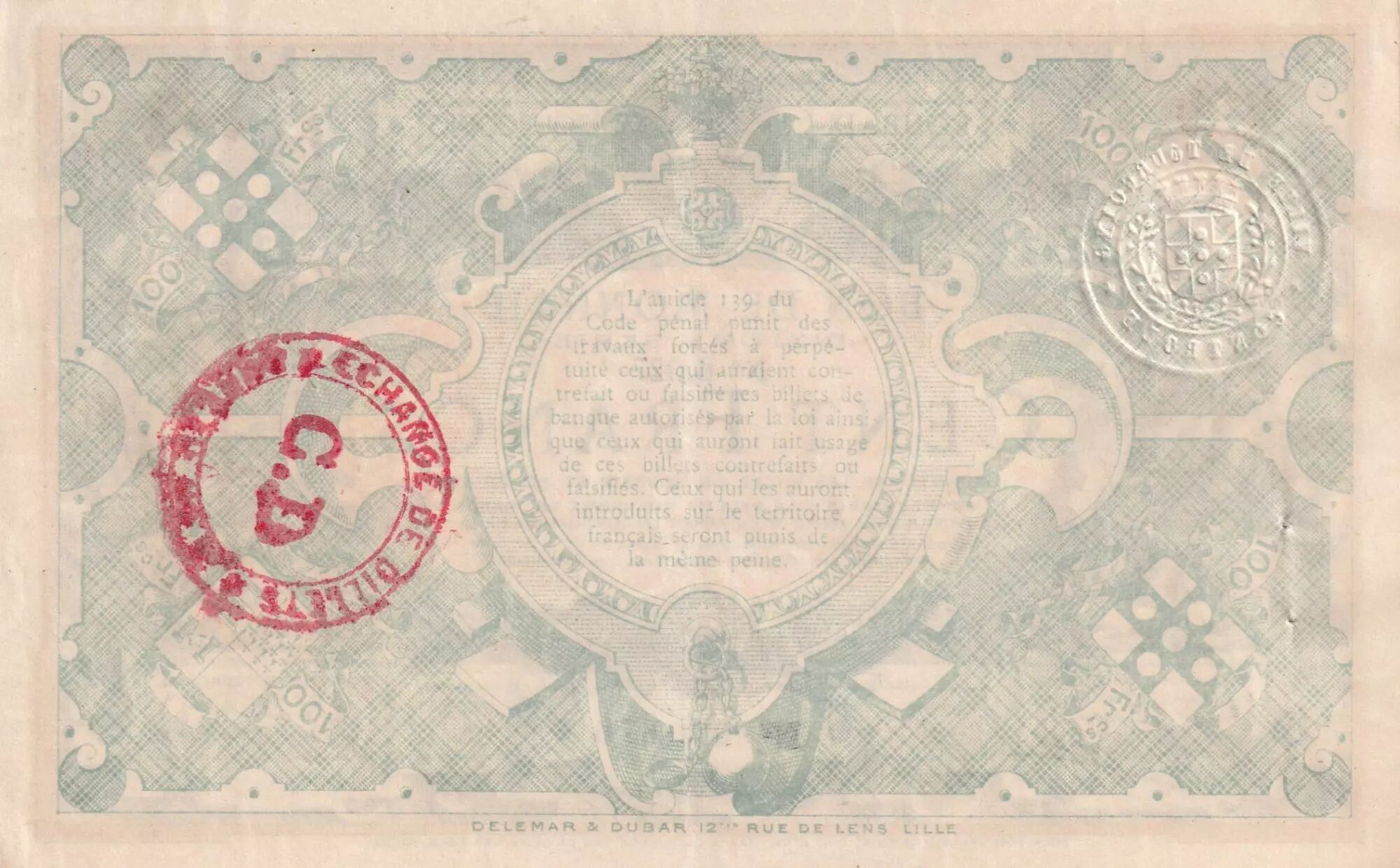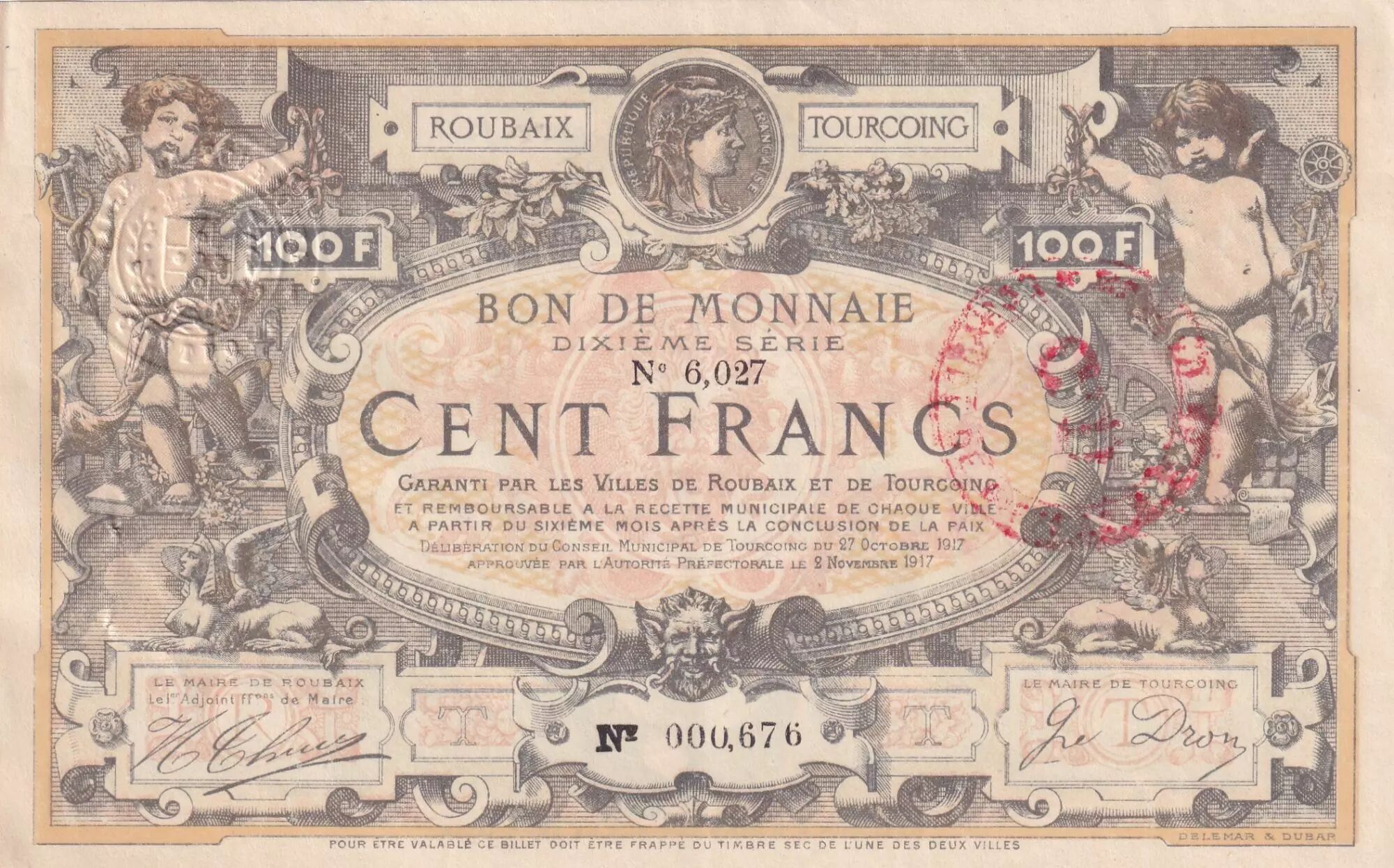 This French necessity note has a face value of 100 francs. It was issued by the communes of Roubaix and Tourcoing, located in the Nord department. The year of issue is 1917.
