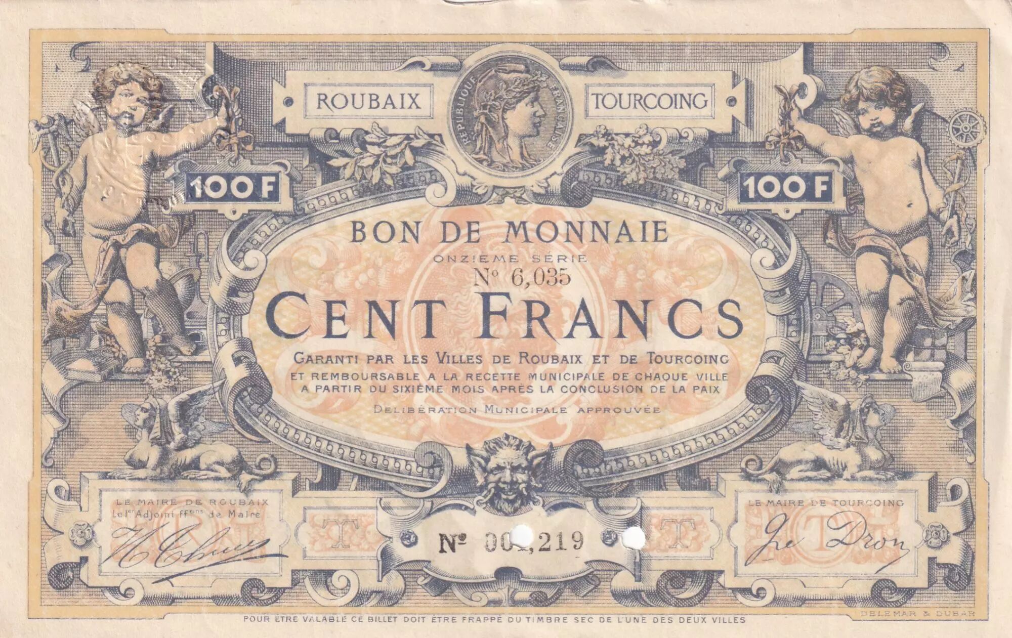 This French emergency banknote has a face value of 100 francs. It was issued by the cities of Roubaix and Tourcoing, located in the Nord department. The year of issue of this banknote is 1914.