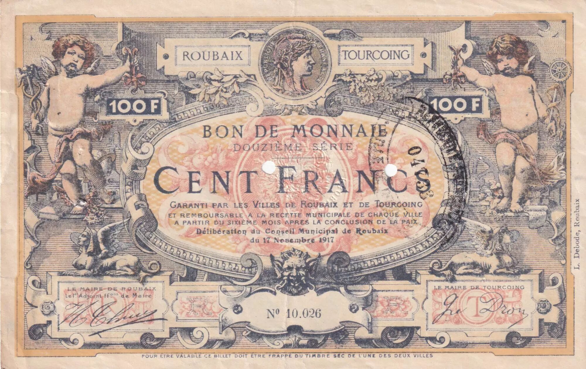 The deliberation of November 17, 1917 refers to the decision taken by the authorities of Roubaix and Tourcoing to issue this 100-franc banknote. This deliberation formalizes the creation and circulation of this local currency.