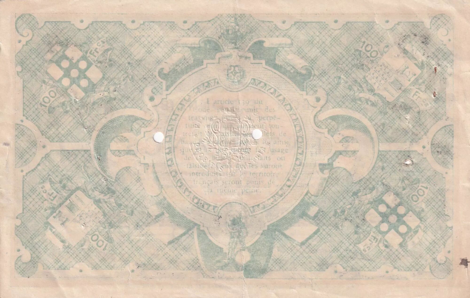This French banknote has a face value of 100 francs. It was issued on November 17, 1917. It belongs to the 12th series of banknotes issued during this period.