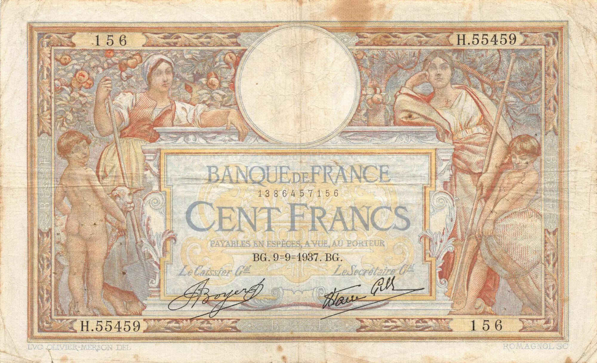 Banknote France 100 Francs Women and childs - 09-09-1937 Serial H.55459 - F