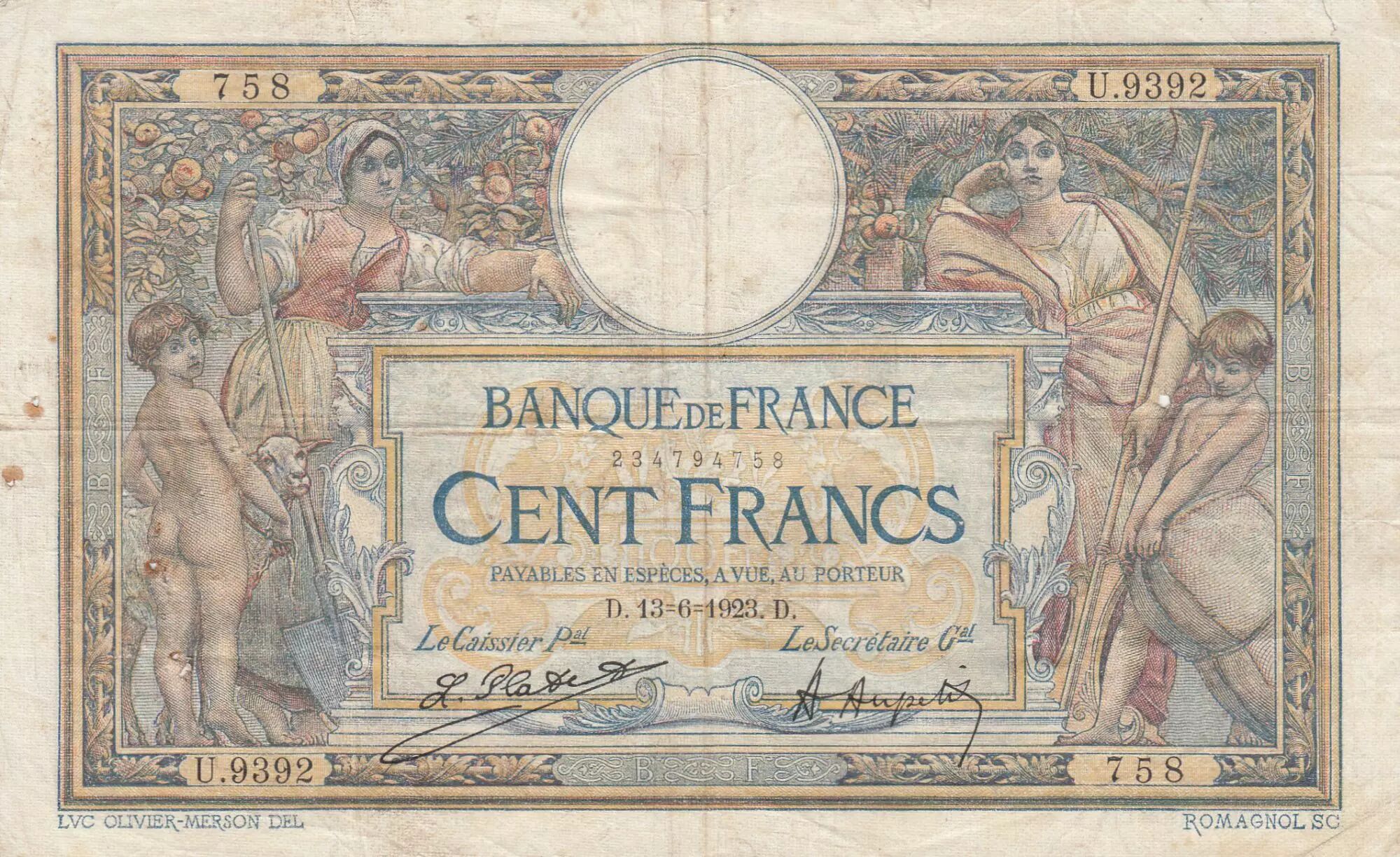 Home > French Banknotes > Bank of France Banknotes > 100 Francs Banknotes > Luc Olivier Merson Type 1906 (1908-1939) > France 100 Francs Women and childs - 13-06-1923 Serial U.9392 - F to VF