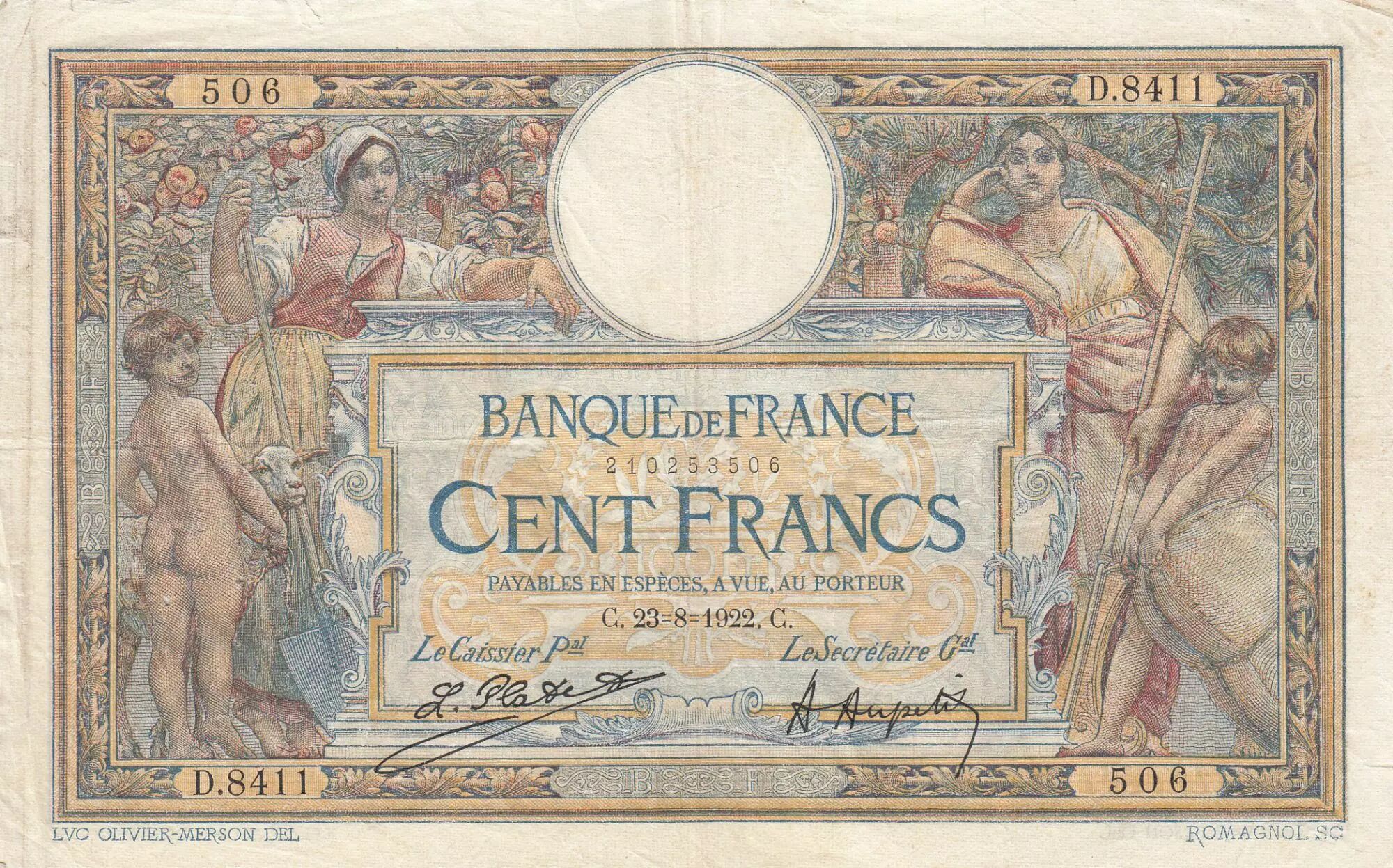 Home > > France 100 Francs Women and childs - 23-08-1922 Serial D.8411 - VF