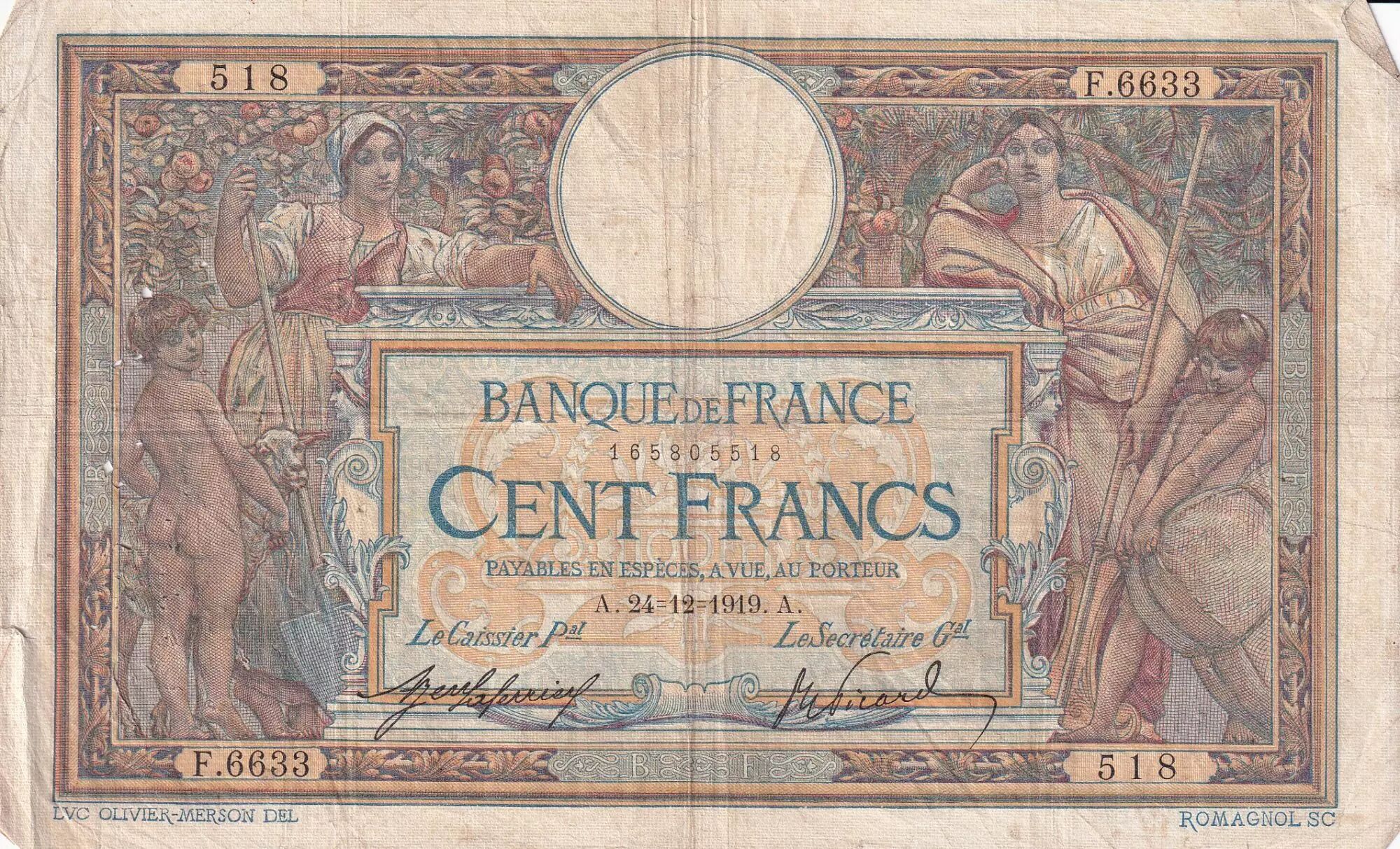 Banknote France 100 Francs Women and childs - 24-12-1919 - Serial F.6633