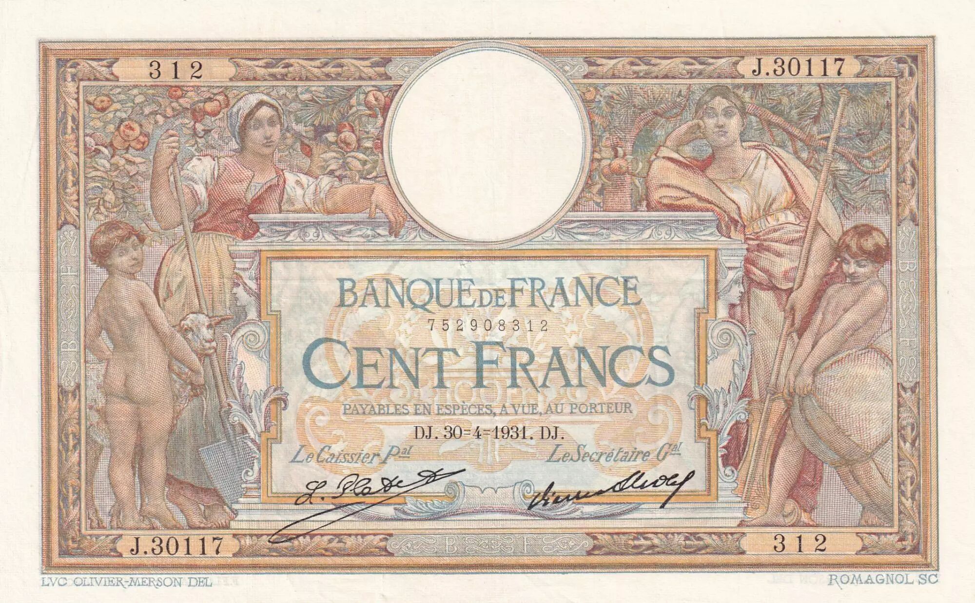 Banknote France 100 Francs Women and childs - 30-04-1931 - Serial J.30117