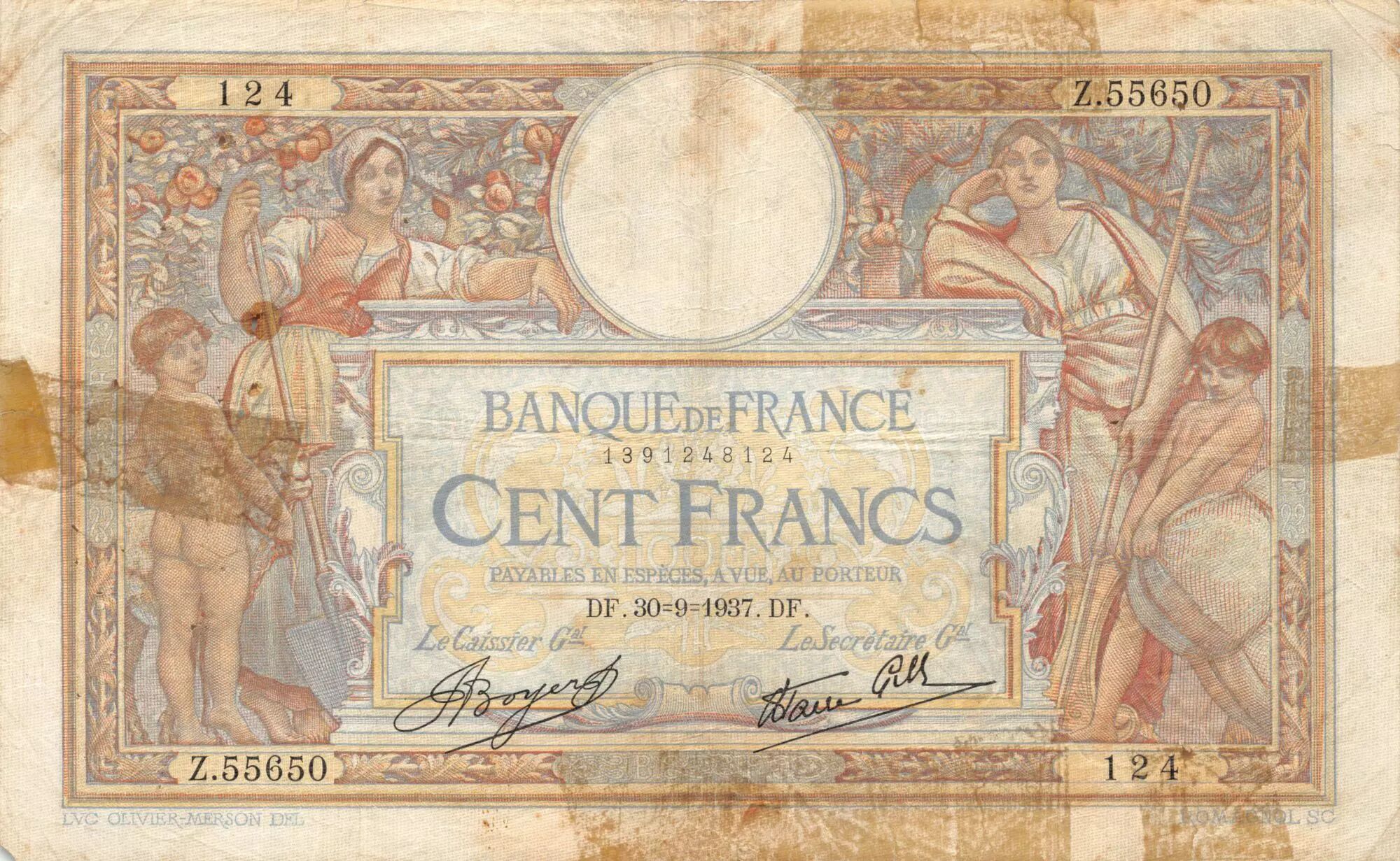 Banknote France 100 Francs Women and childs - 30-09-1937 Serial Z.55650 - G+