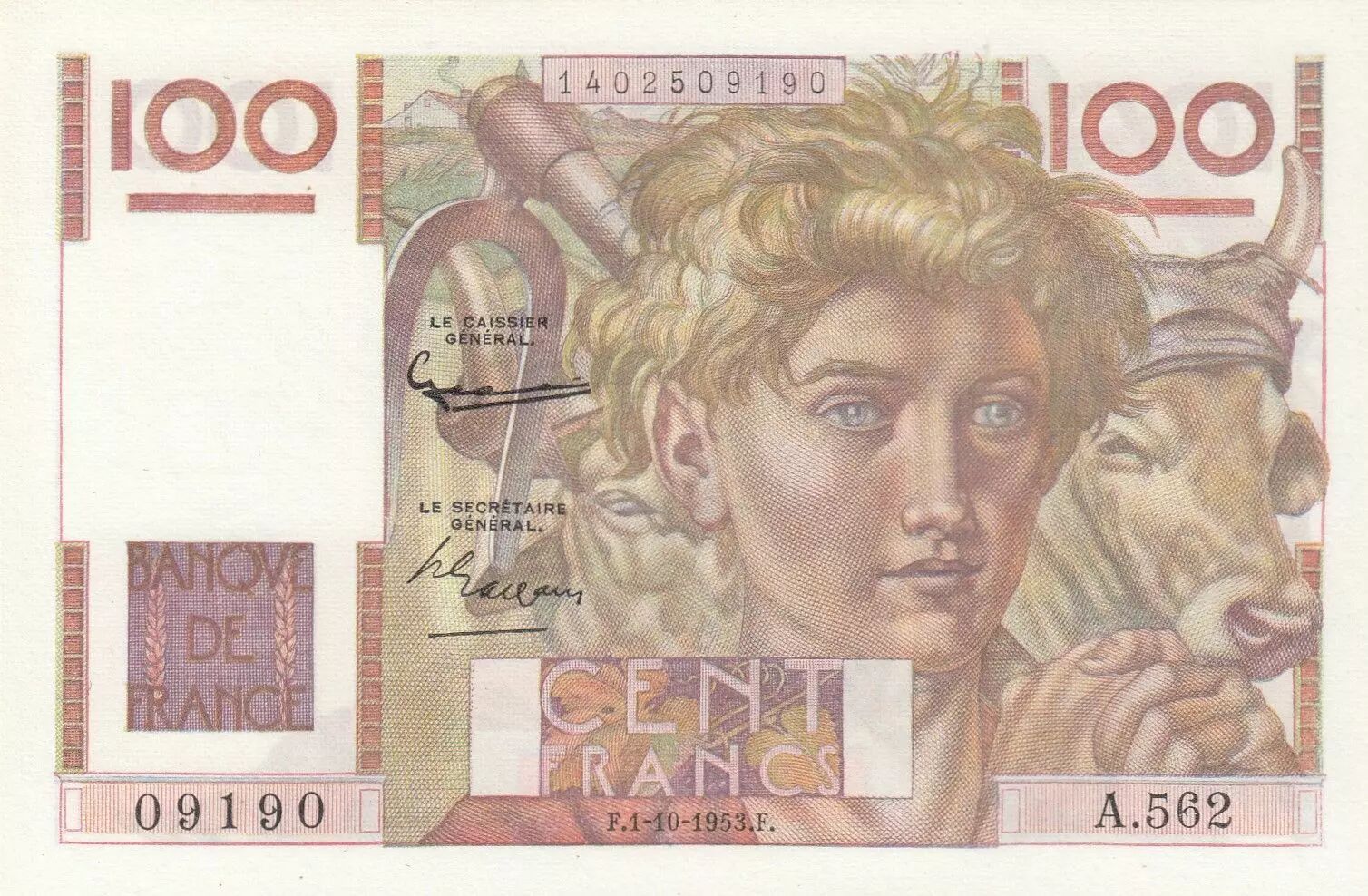Banknote France 100 Francs - Young Farmer - 01-10-1953 - Serial A.562