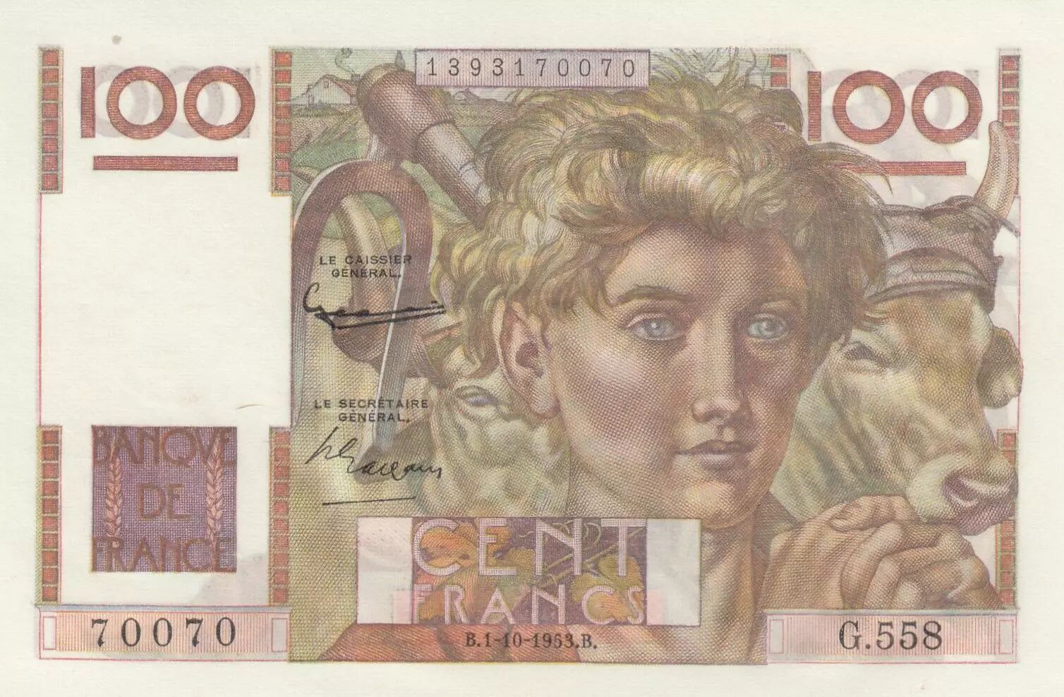 Banknote France 100 Francs - Young farmer - 01-10-1953 - Serial G.558