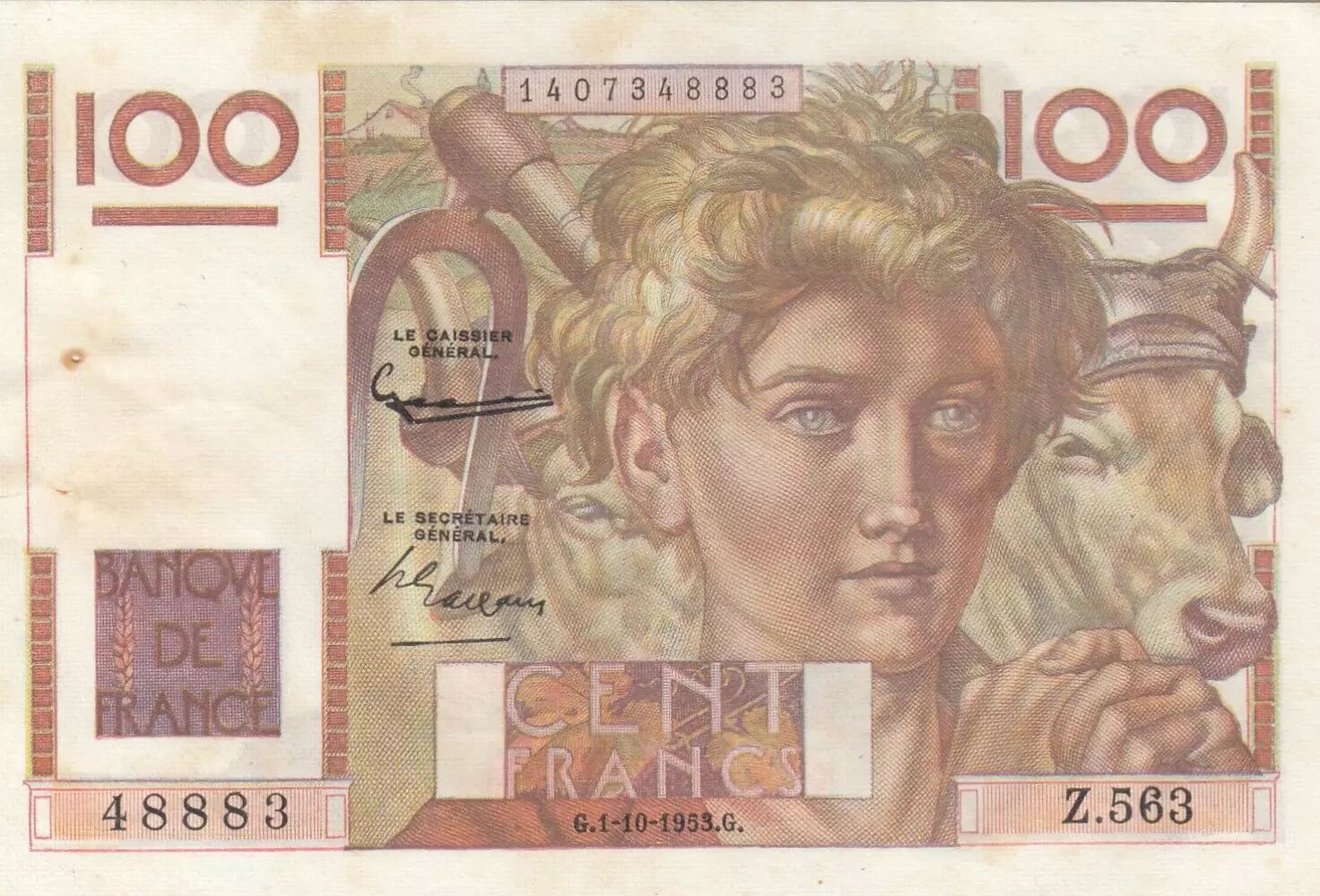 Banknote France 100 Francs - Young farmer - 01-10-1953 - Serial Z.563