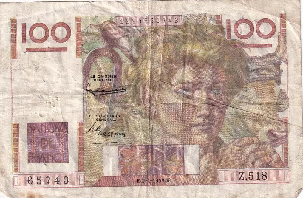 Home > French Banknotes > Bank of France Banknotes > 100 Francs Banknotes > Young Peasant Type 1945 (1945-1954) > France 100 Francs - Young farmer - 02-01-1953 - Serial Z.518 - F.28.35