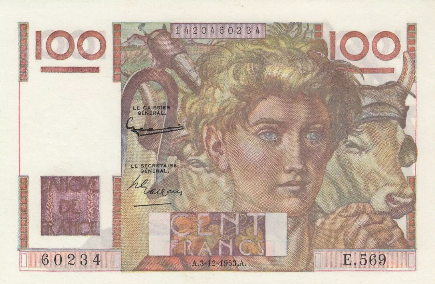 Banknote France 100 Francs - Young Farmer - 03-12-1953 - Serial E.569