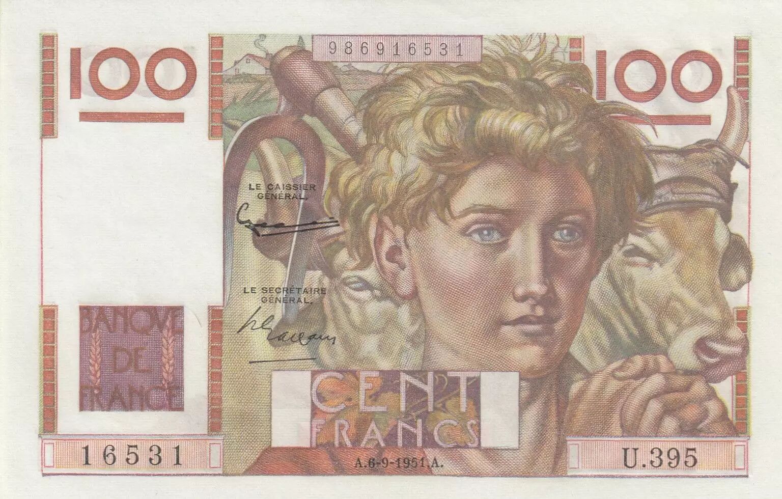 Banknote France 100 Francs - Young Farmer - 06-09-1951 - Serial U.395