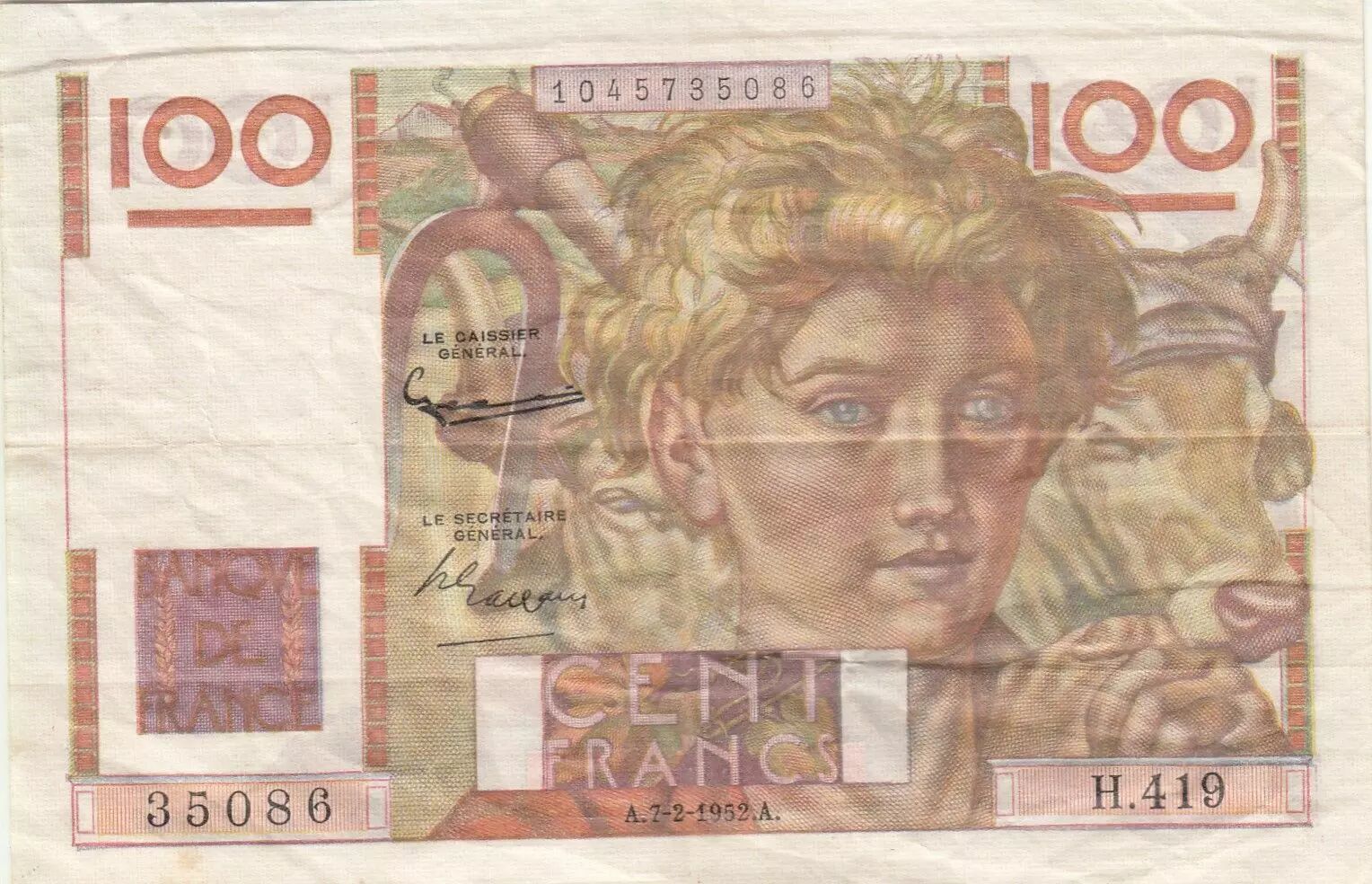 Banknote France 100 Francs - Young Farmer - 07-02-1952 - Serial H.419