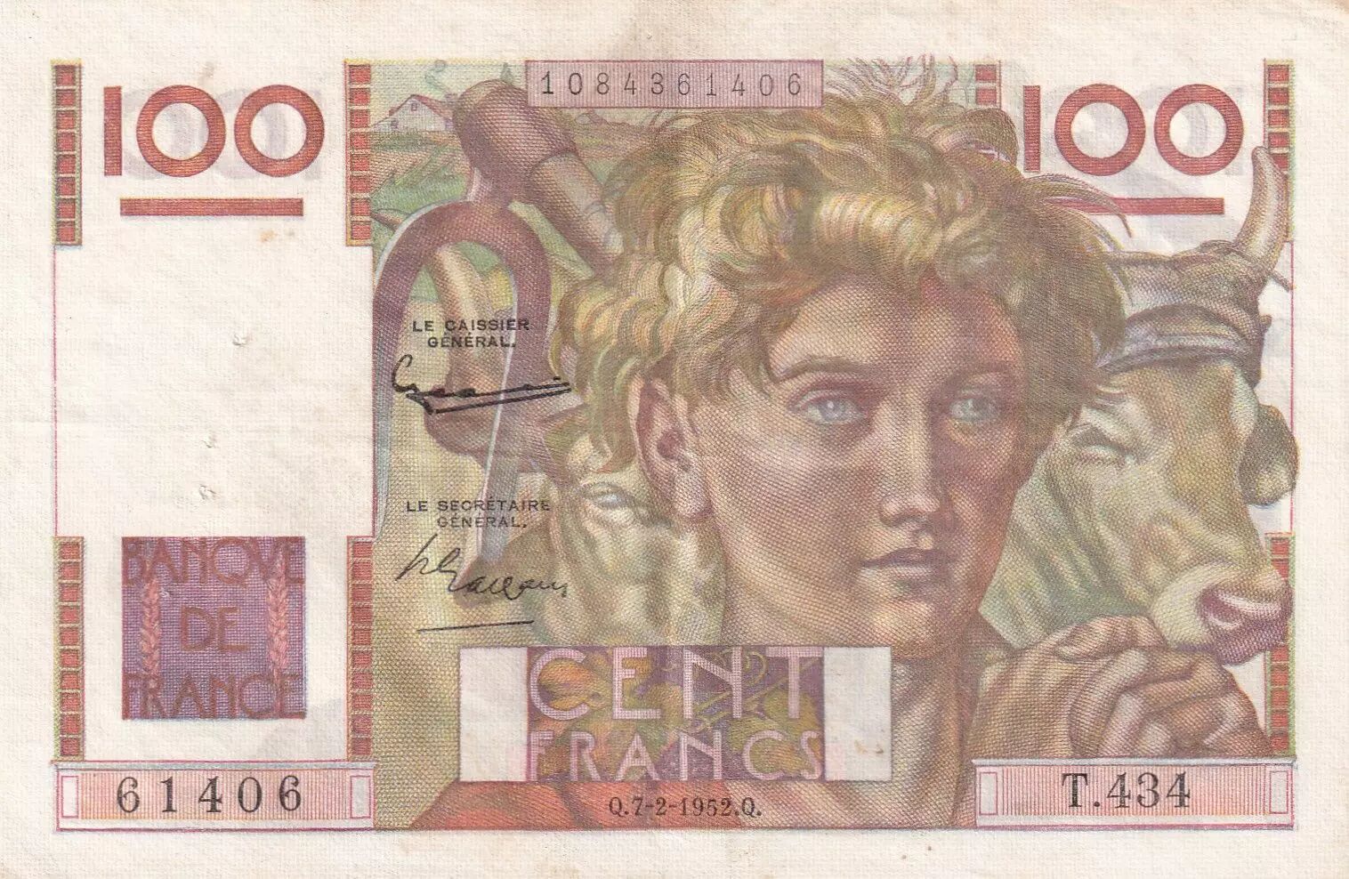 Banknote France 100 Francs Young Farmer - 07-02-1952 - Serial T.434