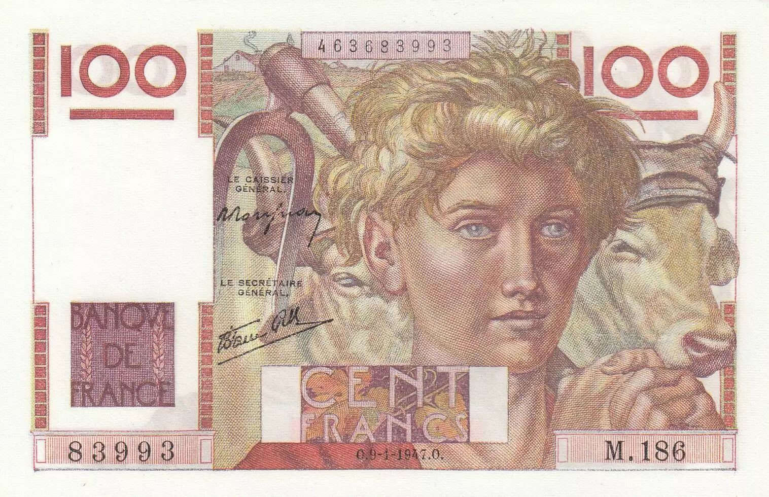 Banknote France 100 Francs - Young farmer - 09-01-1947 - Serial M.186