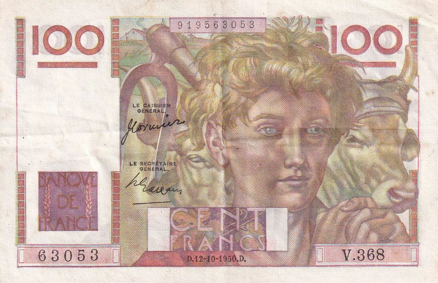 Banknote France 100 Francs - Young farmer - 12-10-1950 - Serial V.368 - P.128