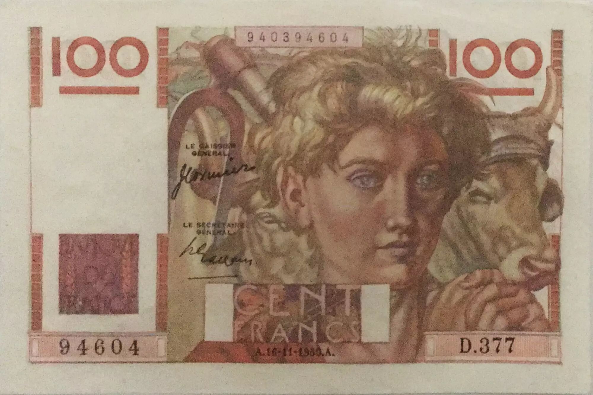 Home > > France 100 Francs Young Farmer - 16-11-1950 - Serial D.377 - XF+