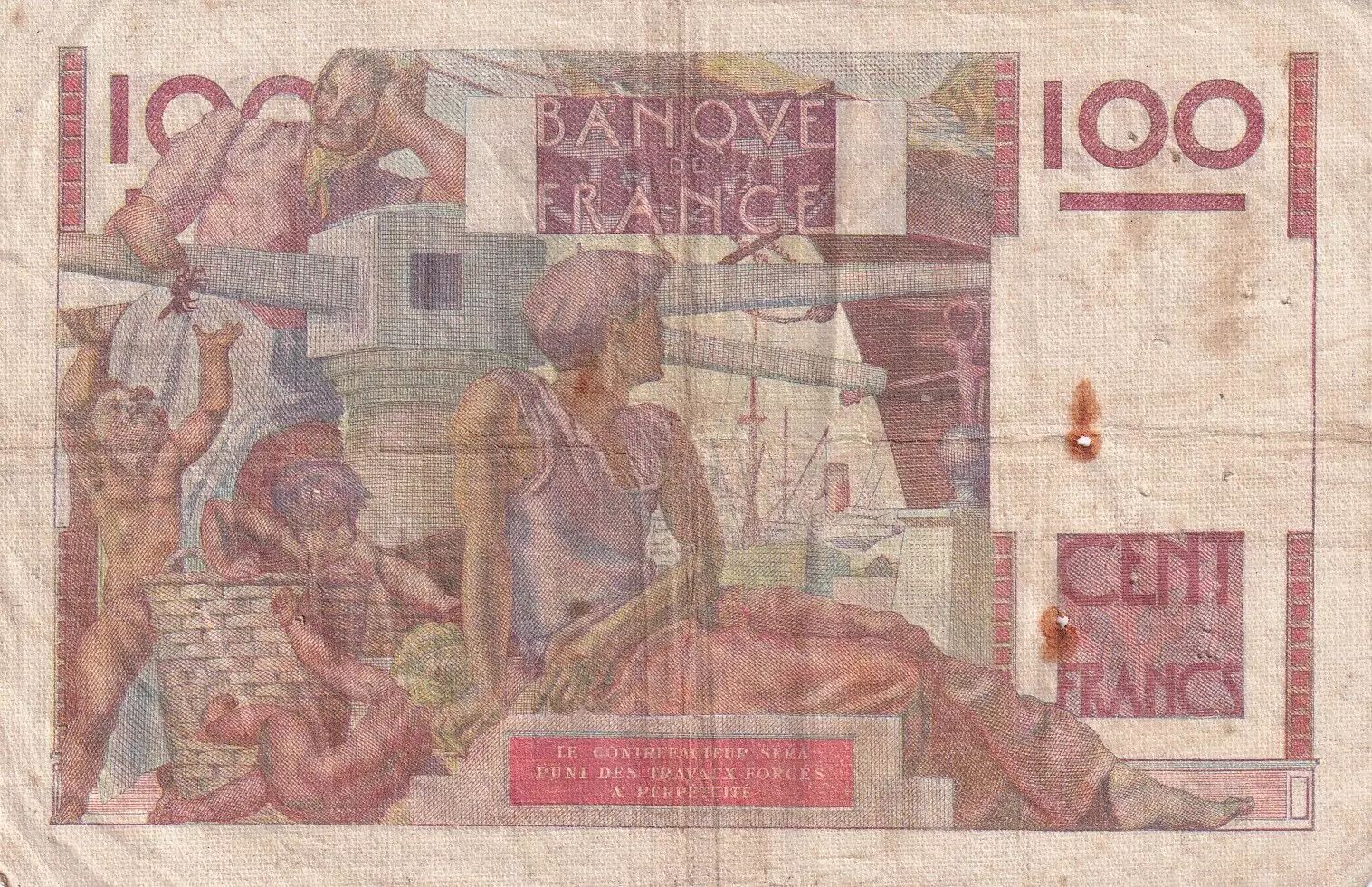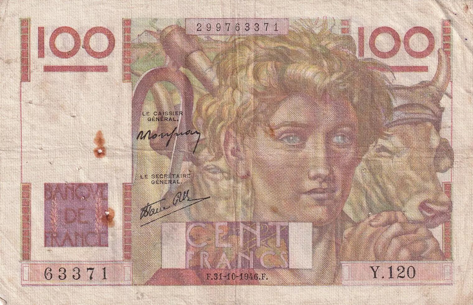 Banknote France 100 Francs - Young farmer - 31-10-1946 - Serial Y.120