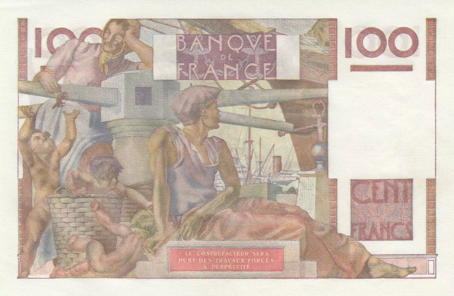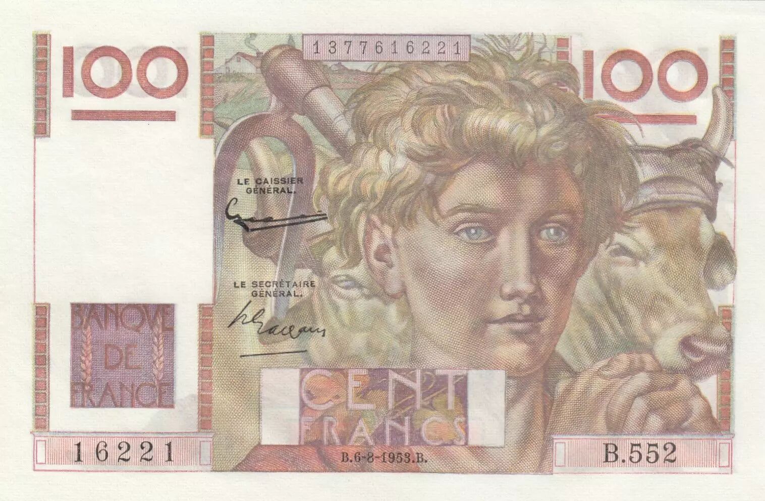 Home > French Banknotes > Bank of France Banknotes > 100 Francs Banknotes > Young Peasant Type 1945 (1945-1954) > France 100 Francs - Young farmer - Inverted Watermak - 06-08-1953 - Serial B.552