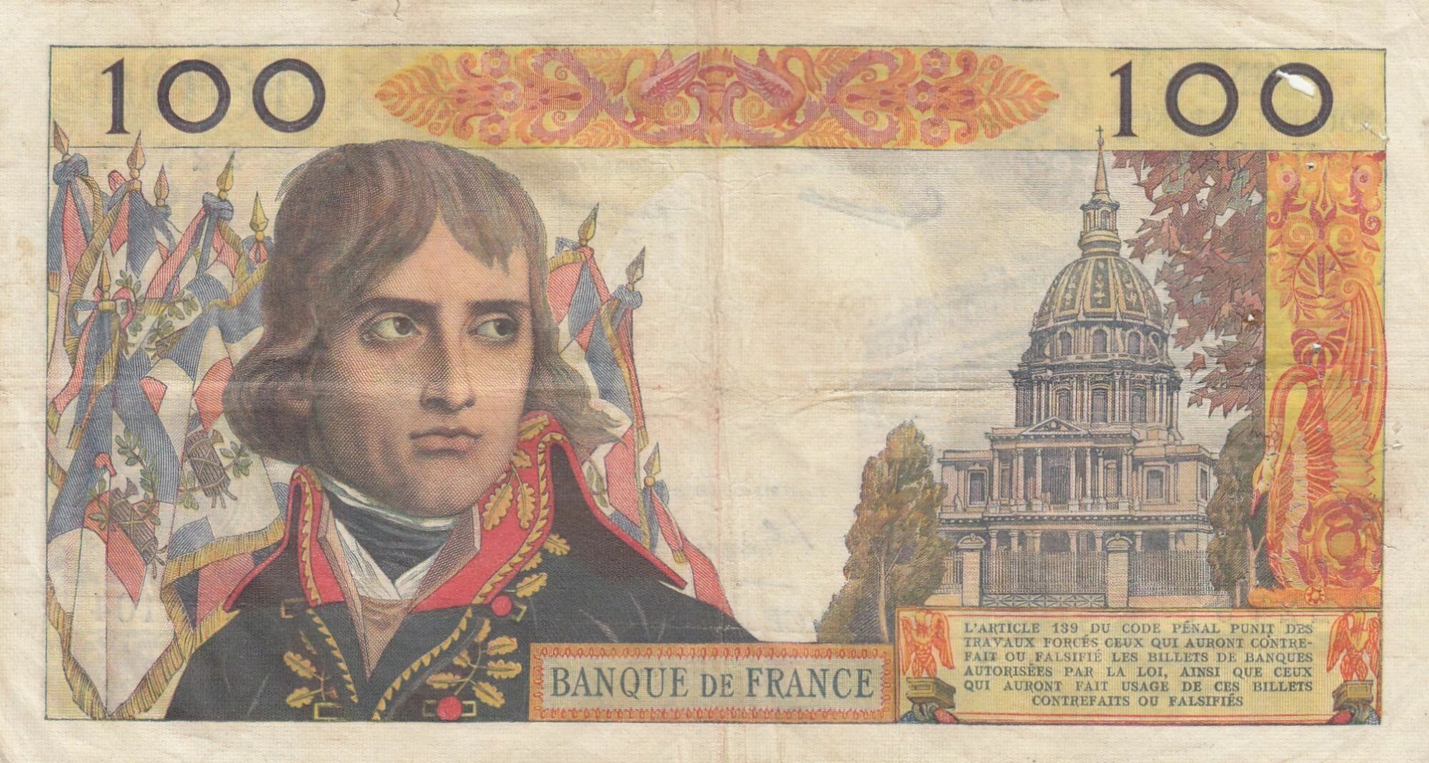 Le recto du billet présente un portrait de Napoléon Bonaparte, reconnaissable à son bicorne et son uniforme. L'arrière-plan est orné de motifs complexes et de symboles impériaux. La valeur nominale, "100 NF", est clairement indiquée, ainsi que la mention de l'institut émetteur.