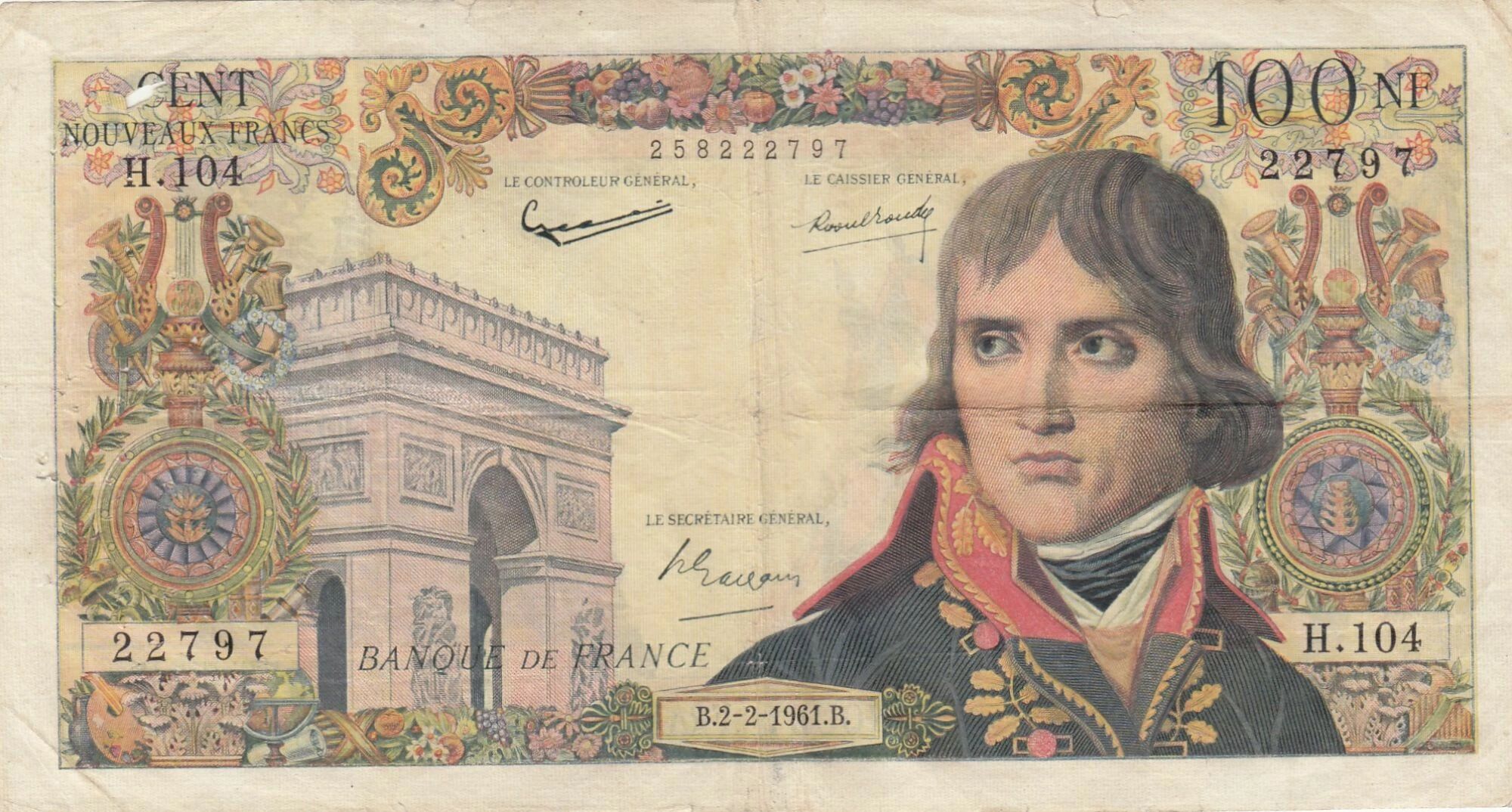 This French banknote, with a face value of 100 new francs, was issued in 1961. It belongs to the H.104 series.
