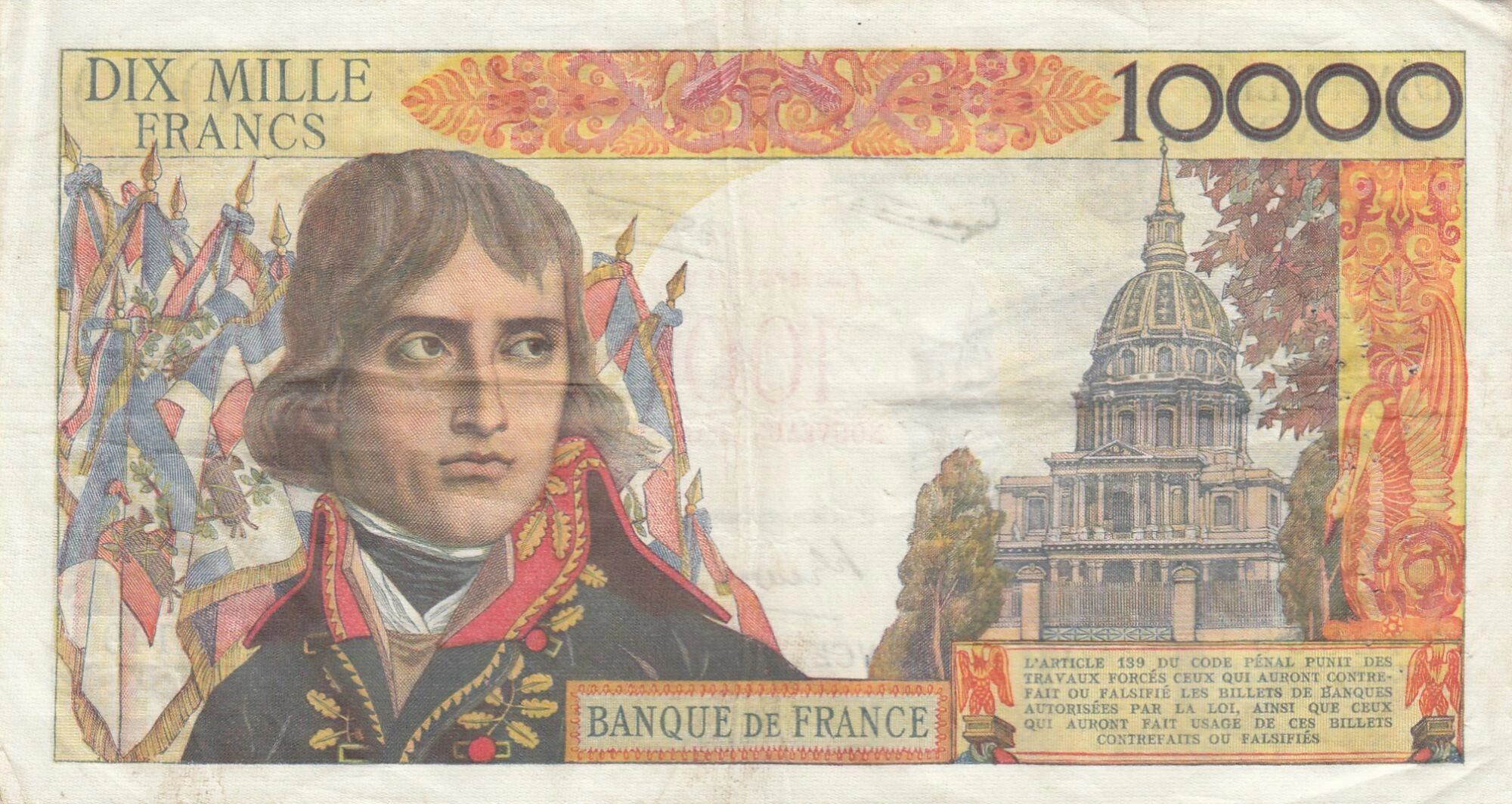 The front of the banknote features a portrait of Napoleon Bonaparte, a French historical figure who was Emperor of the French and King of Italy. The portrait is surrounded by ornamental motifs and the face value of the banknote.