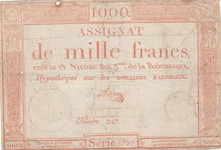 Billet France 1000 francs - 18 Nivose An III (7.1.1795) - Sign. Ariquey