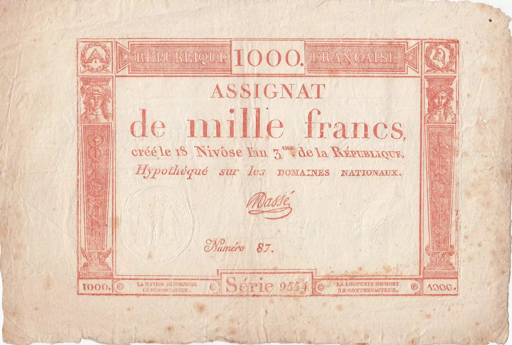Billet France 1000 Francs 18 Nivose An III - 7.1.1795 - Sign. Massé - TTB