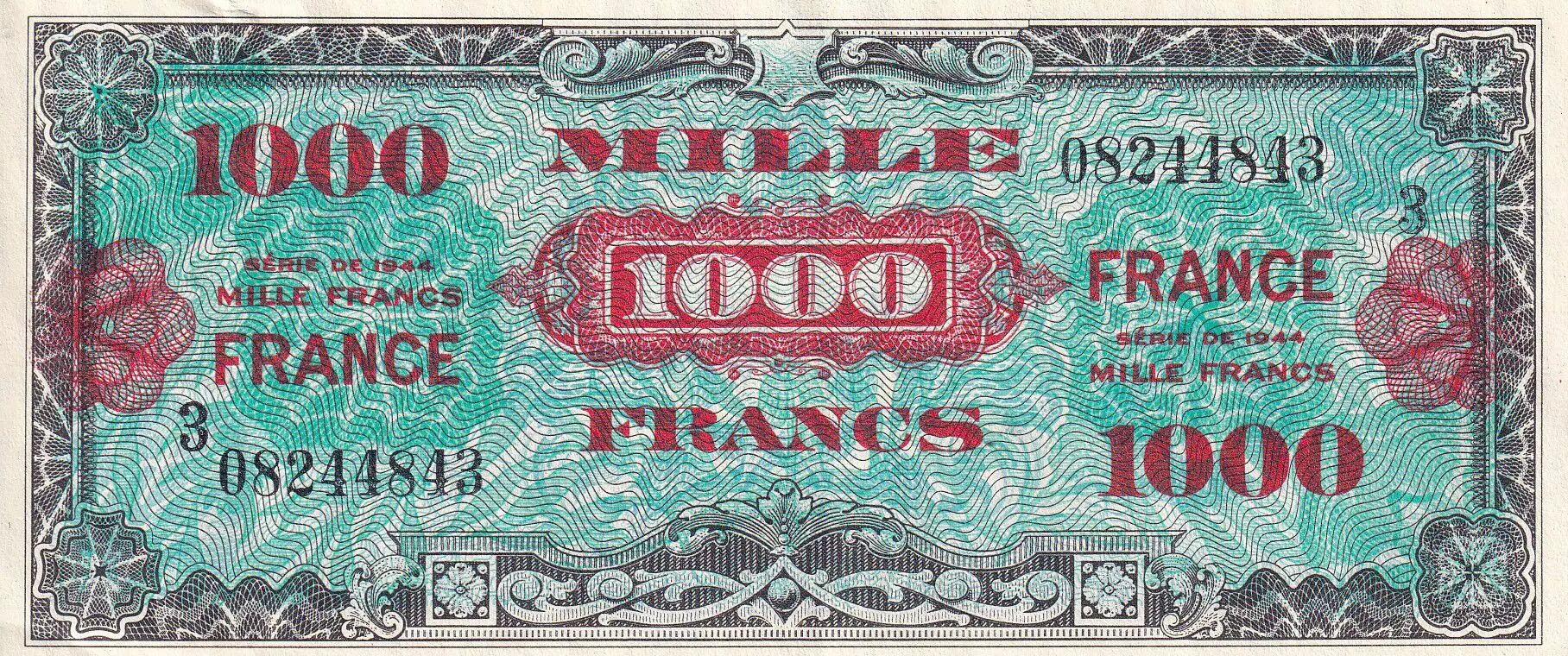 Home > > France 1000 Francs - Allied Military Currency - 1945 - Serial 3 - XF to AU - P.125