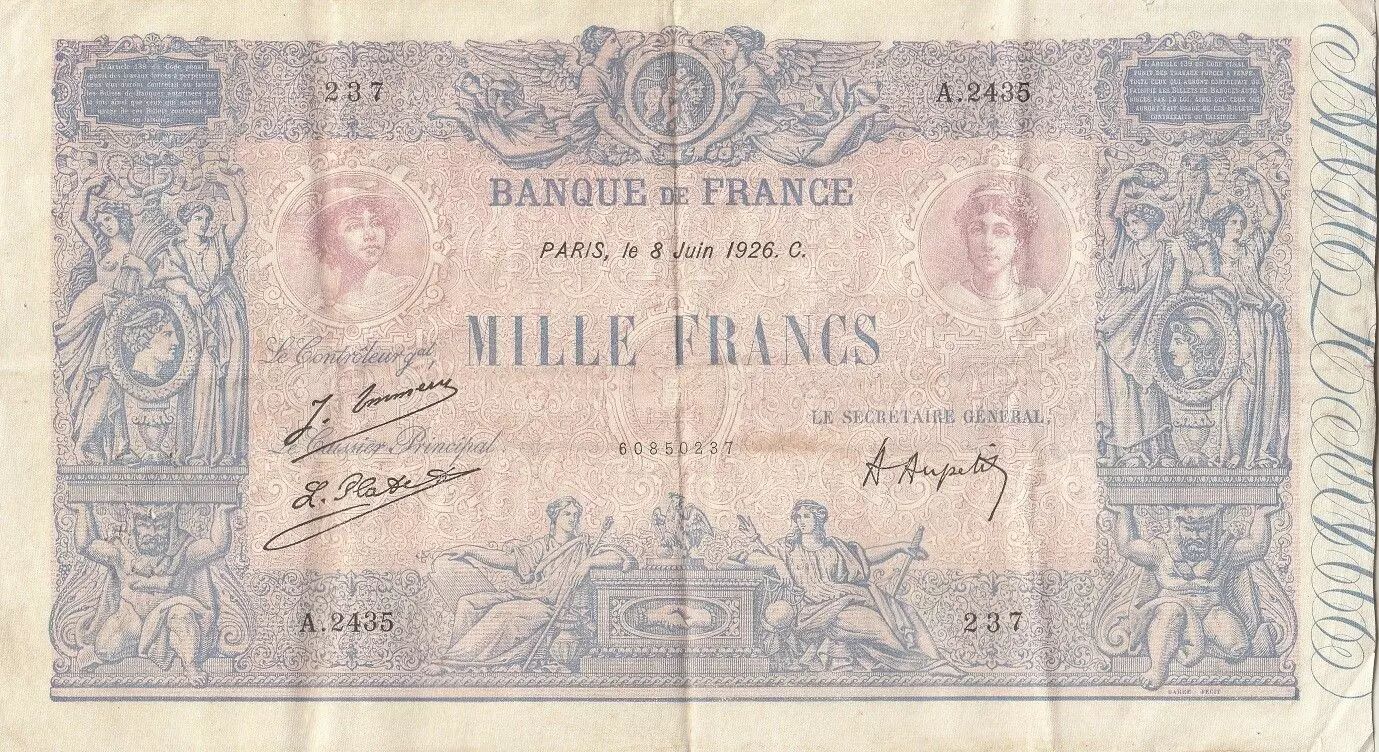 The 1000 Francs banknote, issued on June 8, 1926, is a testament to French monetary history. This banknote belongs to series A.2435. The face value of this banknote is 1000 francs, a considerable sum for the time, reflecting a period of inflation and economic changes in France.