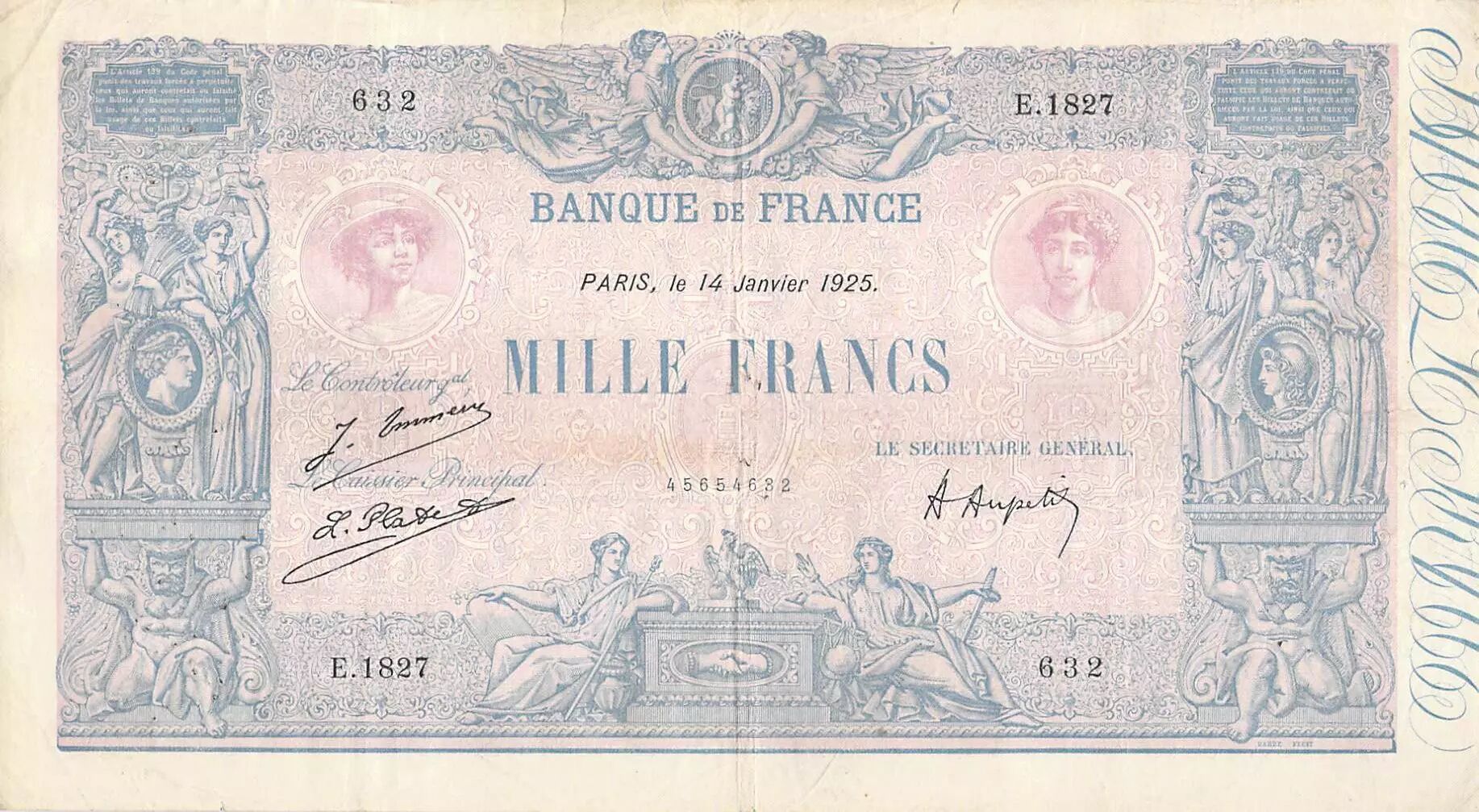 Home > French Banknotes > Bank of France Banknotes > 1000 Francs Banknotes > Blue and Pink Type 1889 (1889-1926) > France 1000 Francs Blue on lilac - 14-01-1925 - Serial E.1827 - F to VF