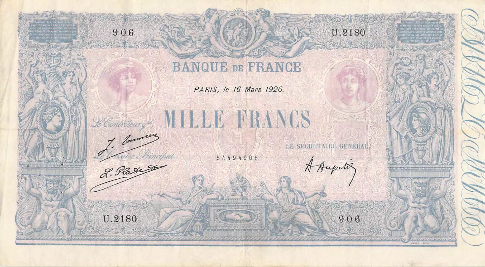 Banknote France 1000 Francs Blue on lilac - 16-03-1926 - Serial U.2180 - VF